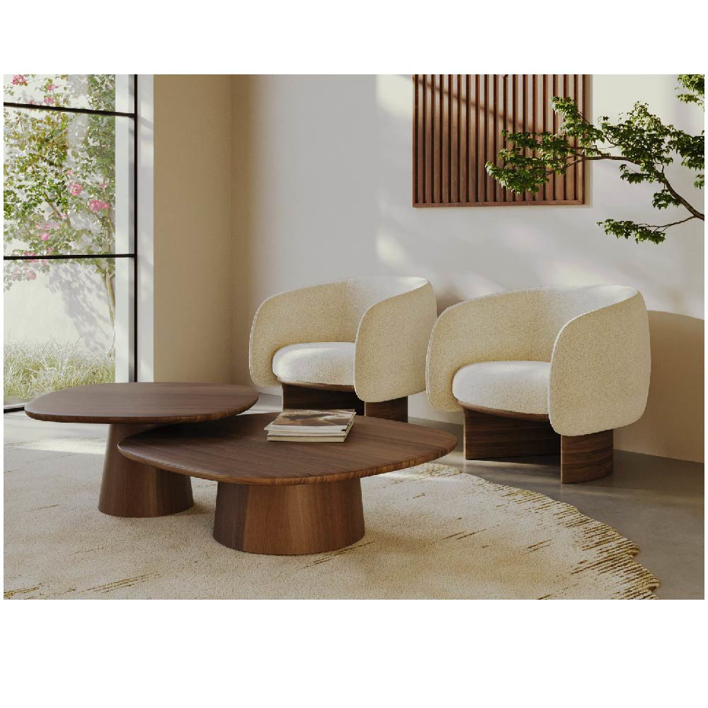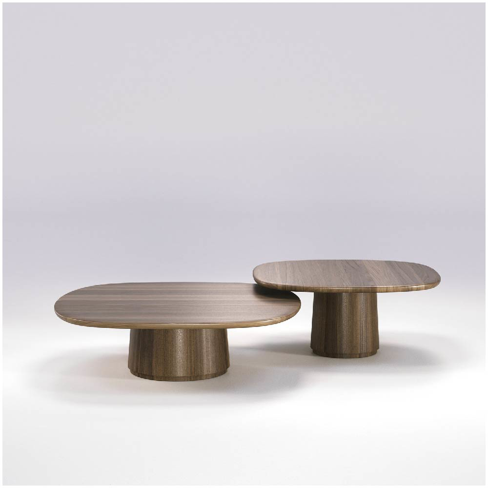 The Amos coffee/side tables come in a set of two tables with different dimensions that are inspired by the Amos dining table. As well as creating visual intrigue, the conical base of Amos provides exceptional stability, effortlessly supporting the solid wood tabletop.