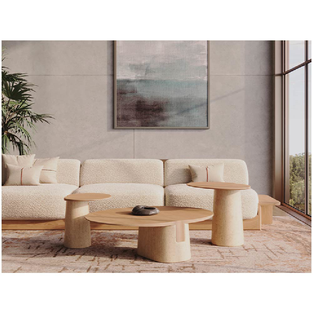 Anchor is a set of tables comprising two side tables and a coffee table, crafted from a combination of wood and stone that adds depth and versatility, making it adaptable to a variety of interior styles.