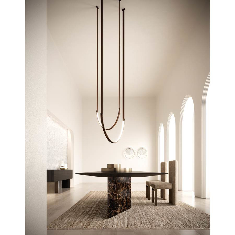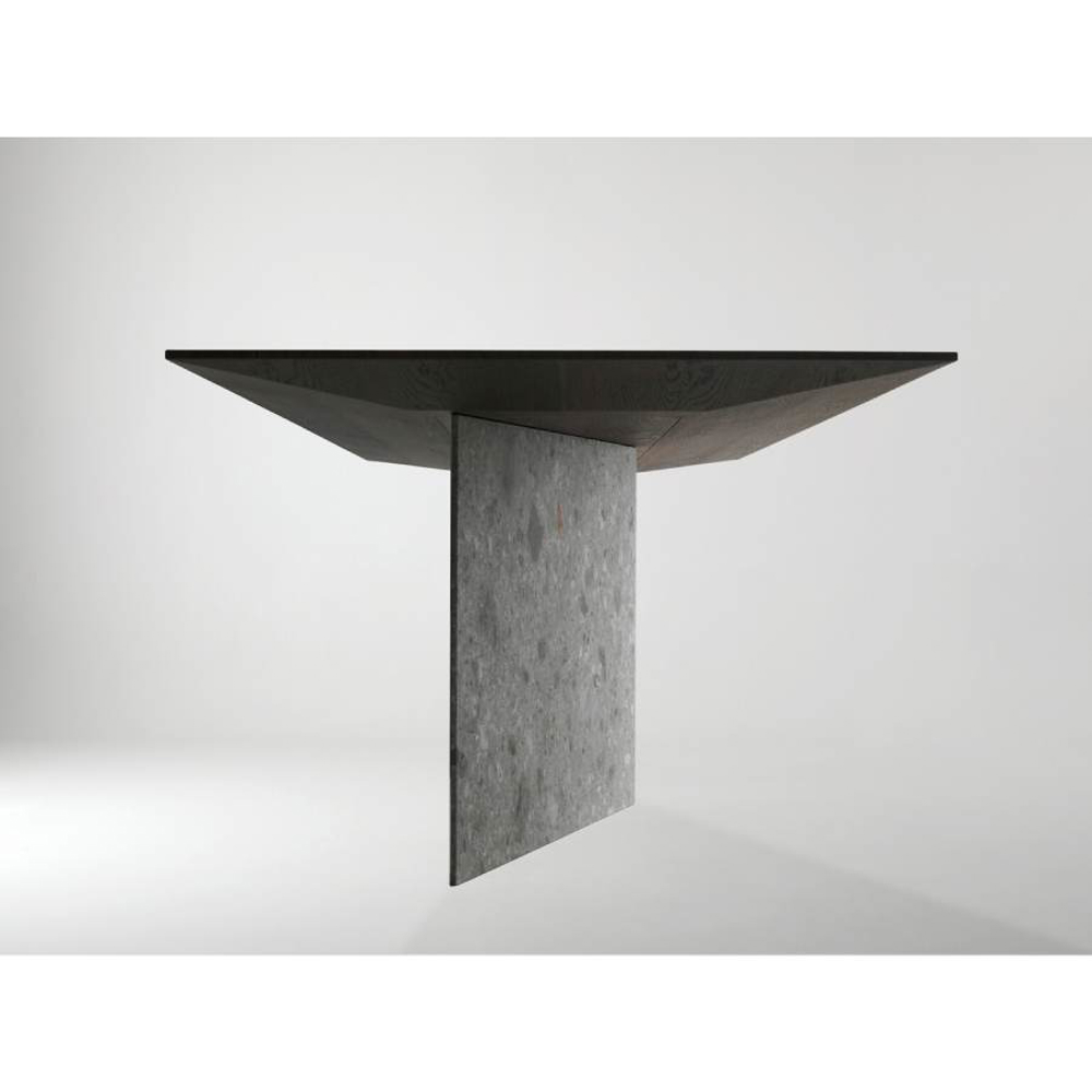 An essential balance of lines and volumes determines the elegant composition which juxtaposes a sculptural foot and a top with slender proportions obtained by tapering the thickness of the perimeter to the extreme.