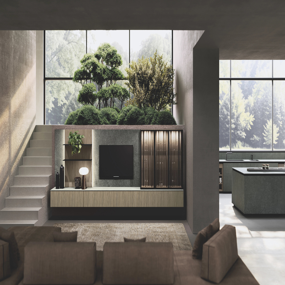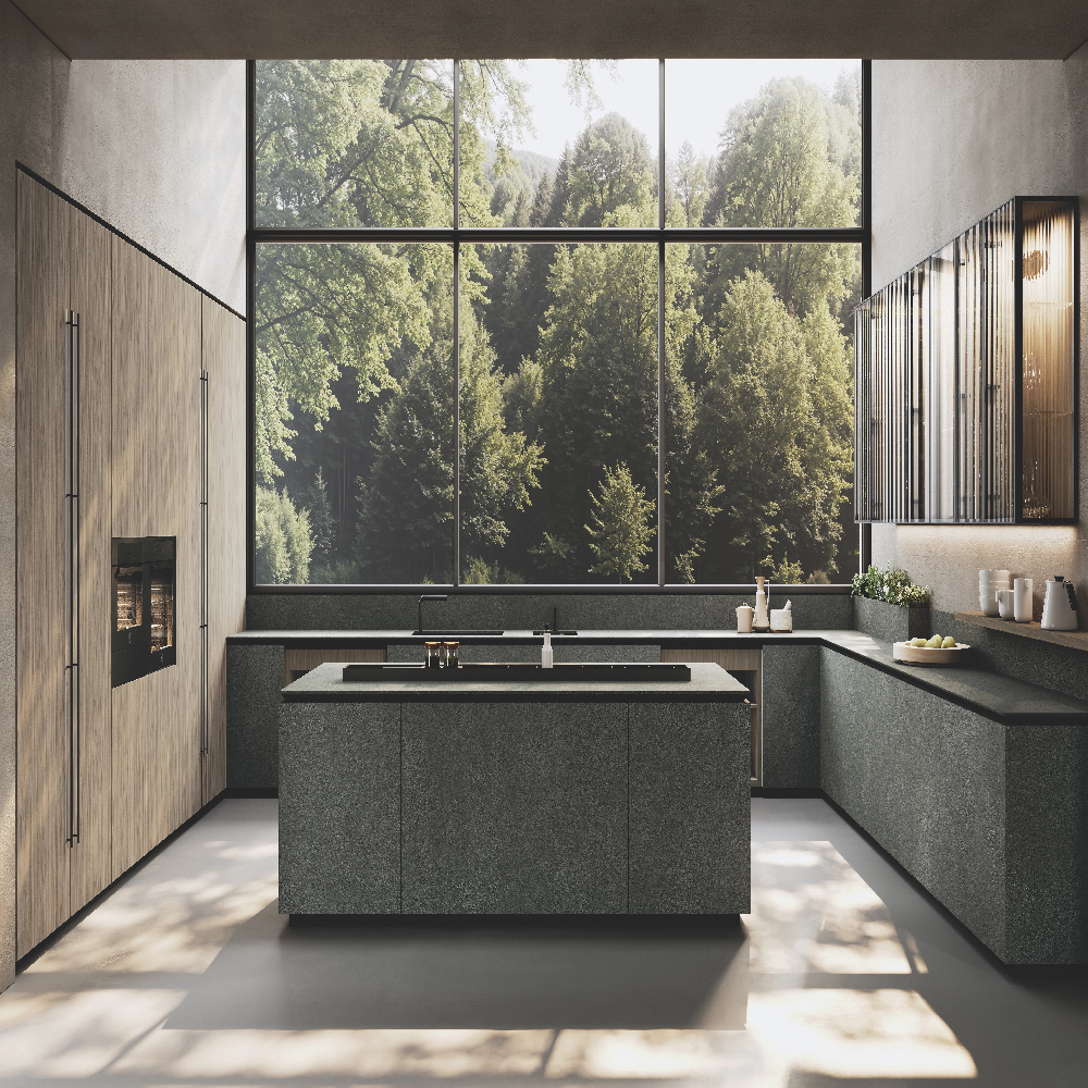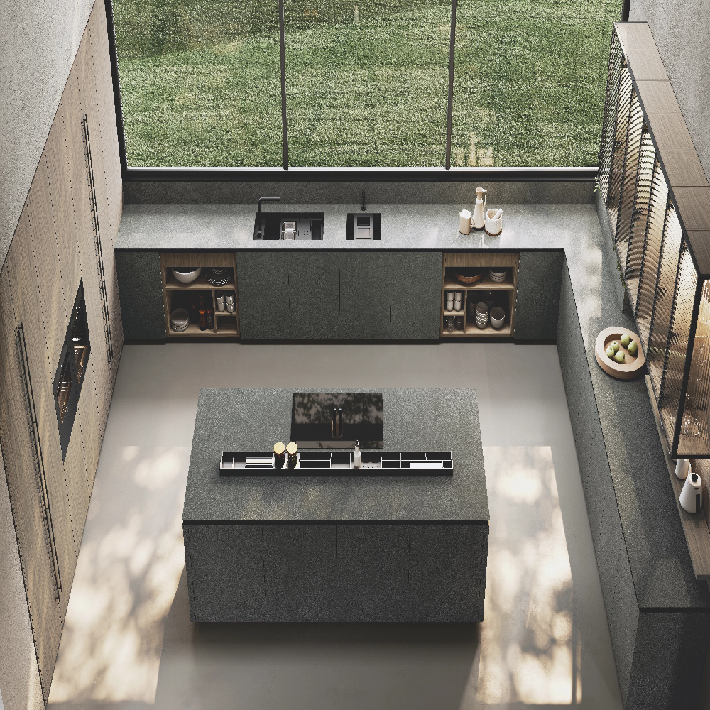 Wall-mounted columns in Noce Salina wood bilaminate, with vertical Libra handles in black finish. In the center, the Balance island features a 45˚ profile in Chester Green finish, with Emme groove opening. The worktop, with Mini Slide profile, is in Balance Chester Green Nat stone (porcelain).