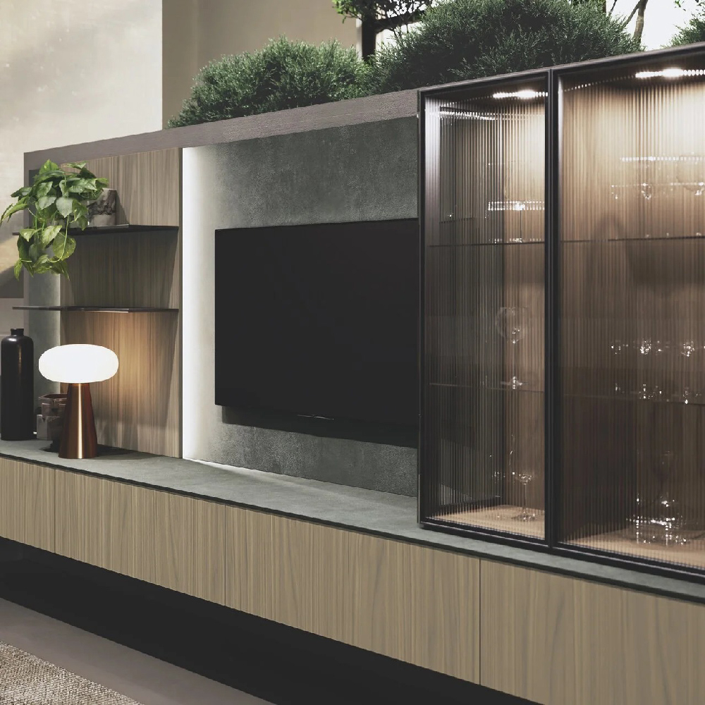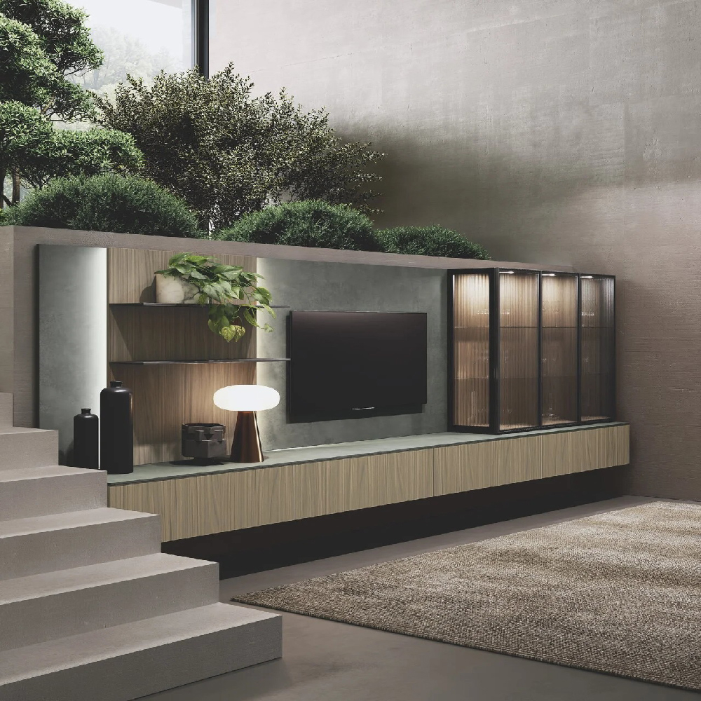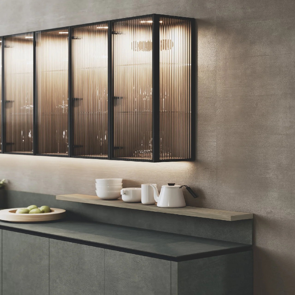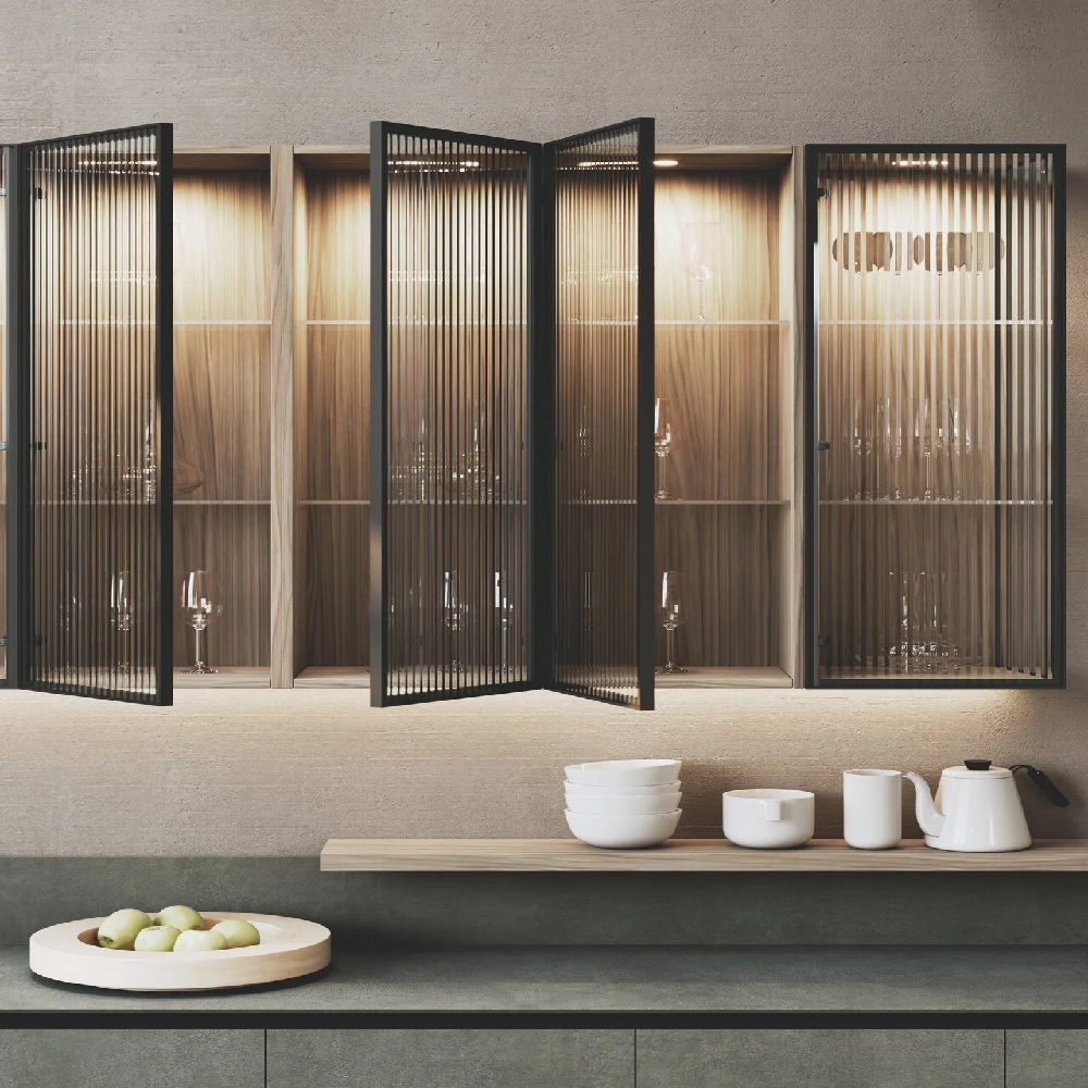 Wall-mounted columns in Noce Salina wood bilaminate, with vertical Libra handles in black finish. In the center, the Balance island features a 45˚ profile in Chester Green finish, with Emme groove opening. The worktop, with Mini Slide profile, is in Balance Chester Green Nat stone (porcelain).