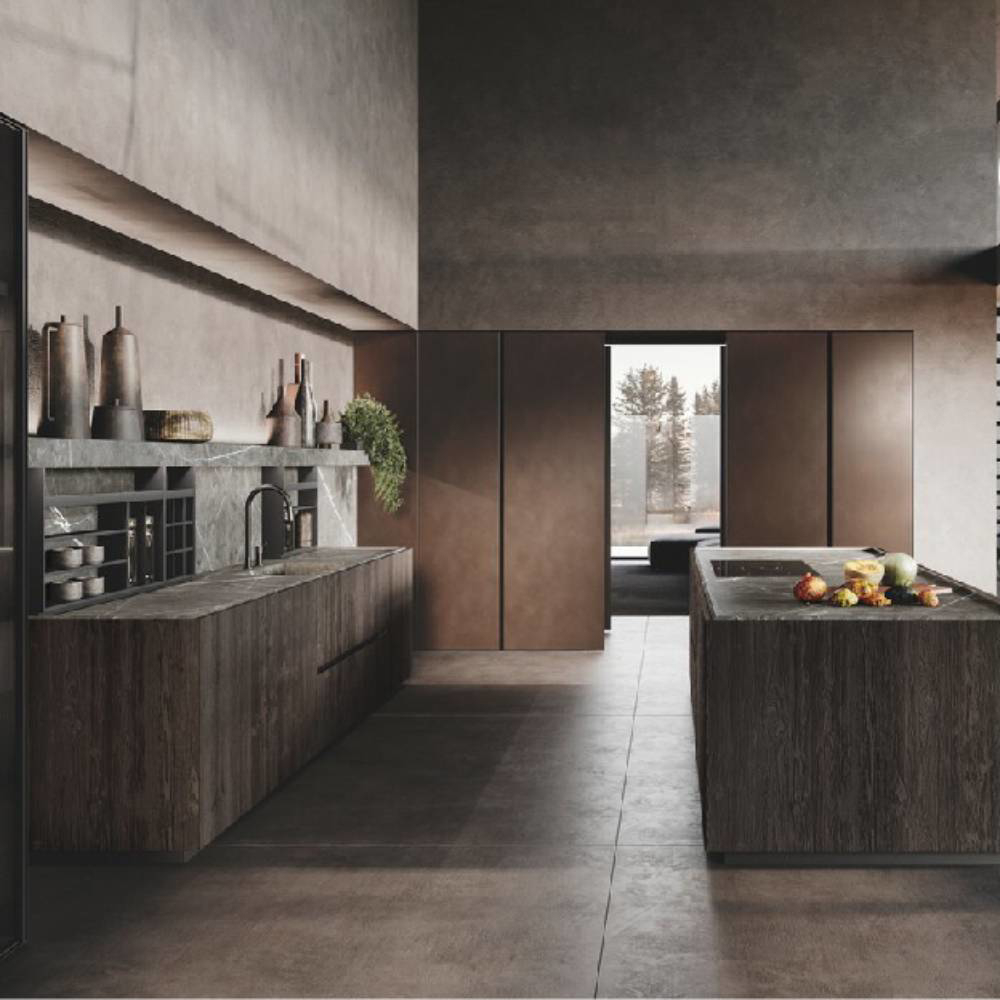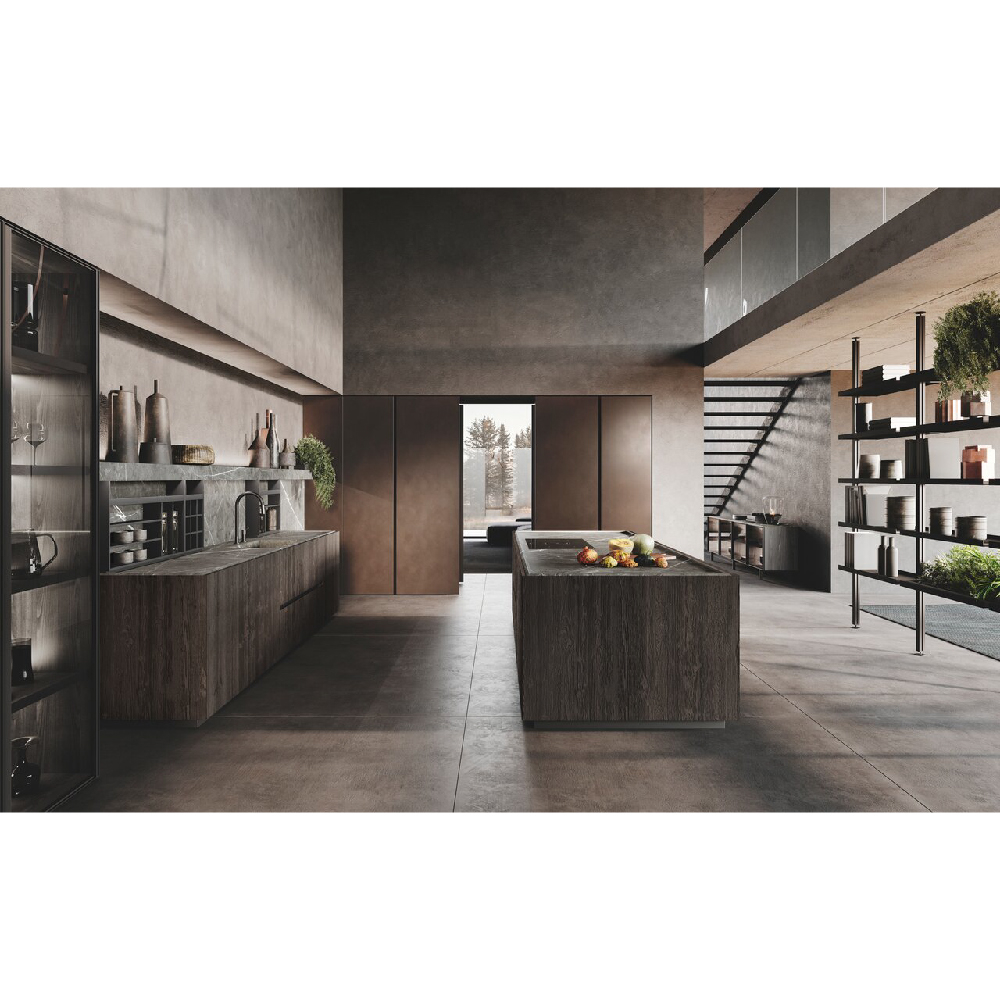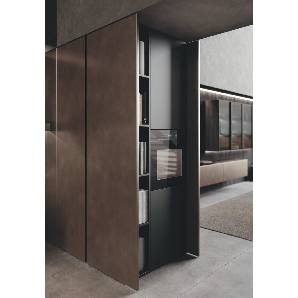An entire ambient that connects spaces in the home, removing the distinction between kitchen and living space. By using the pillat columns, vertical functional and storage units, each space is open yet enclosed, similar to wide open theatrical space. Two innovative materials characterize the composition: on the one hand, the 4.0 metal lacquer that covers the columns and enhances the modernity of the whole, on the other the Old black fir wood, which constitutes the central island conceived as a monolithic block. It is specially recovered from the external coats of farms and tabiàs, homes and barns very common in Trentino-Alto Adige and Friuli-Venezia Giulia. It is reborn to new life through cleaning and stucco operations and through careful craftsmanship, it is unique in that its appearance and the nuances it presents have been determined exclusively by the joint action of the sun and atmospheric agents such as snow, rain and wind. Antoher important element is the innovative Spiga worktop made in Gres material. The inclination of 30° doors and the top create a nice gap, the space in the shade enhances the concept of a new functional aesthetics where shadow cones give access to spaces equipped and operational.