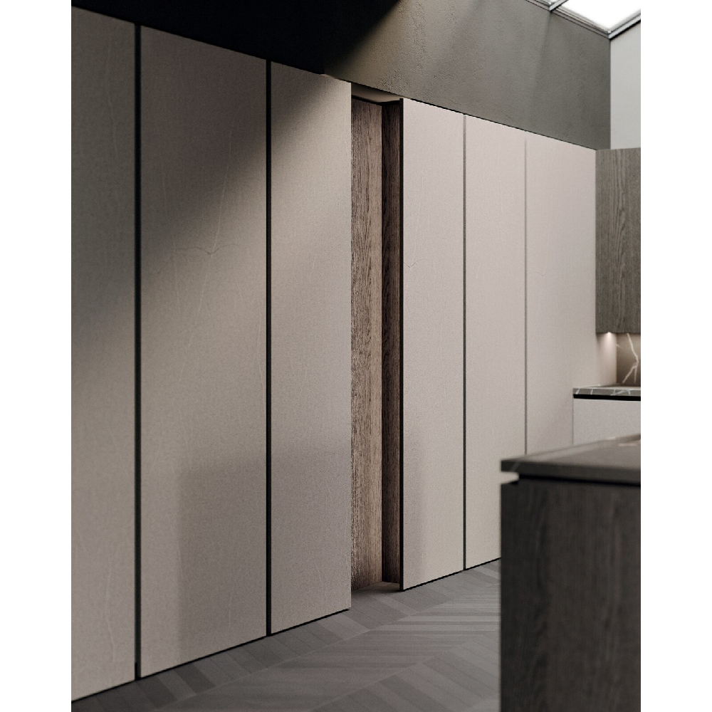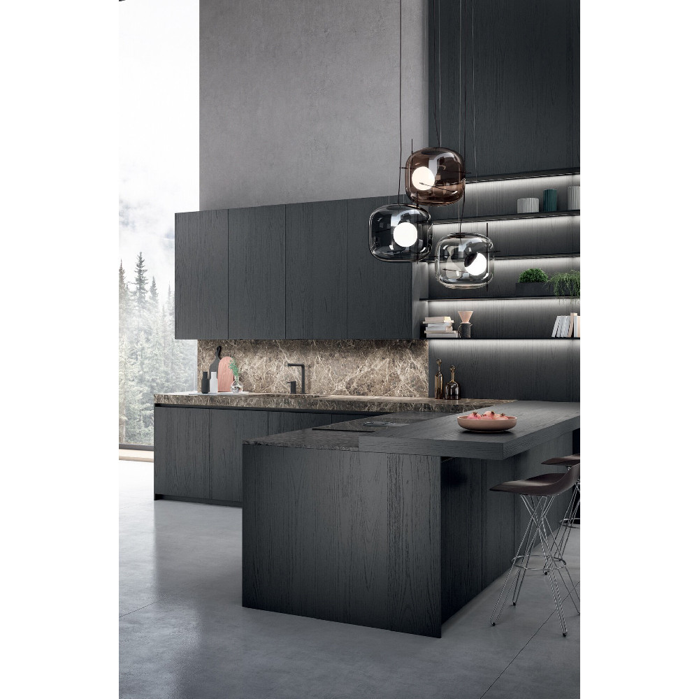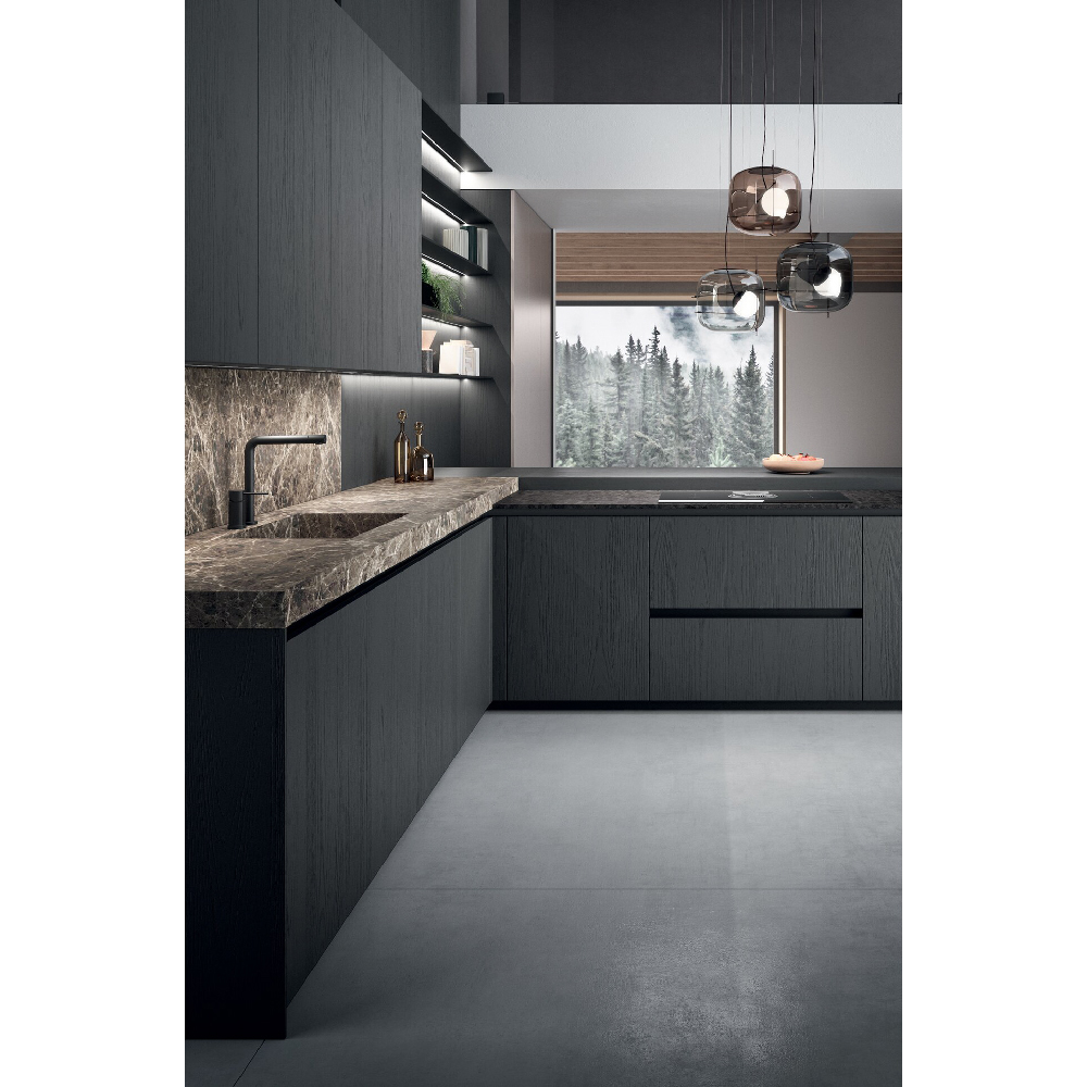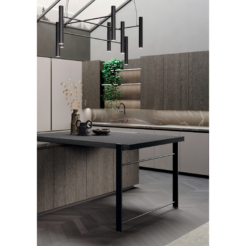 An entire ambient that connects spaces in the home, removing the distinction between kitchen and living space. By using the pillat columns, vertical functional and storage units, each space is open yet enclosed, similar to wide open theatrical space. Two innovative materials characterize the composition: on the one hand, the 4.0 metal lacquer that covers the columns and enhances the modernity of the whole, on the other the Old black fir wood, which constitutes the central island conceived as a monolithic block. It is specially recovered from the external coats of farms and tabiàs, homes and barns very common in Trentino-Alto Adige and Friuli-Venezia Giulia. It is reborn to new life through cleaning and stucco operations and through careful craftsmanship, it is unique in that its appearance and the nuances it presents have been determined exclusively by the joint action of the sun and atmospheric agents such as snow, rain and wind. Antoher important element is the innovative Spiga worktop made in Gres material. The inclination of 30° doors and the top create a nice gap, the space in the shade enhances the concept of a new functional aesthetics where shadow cones give access to spaces equipped and operational.