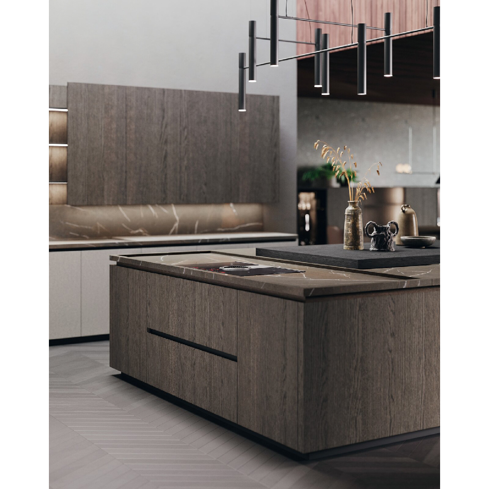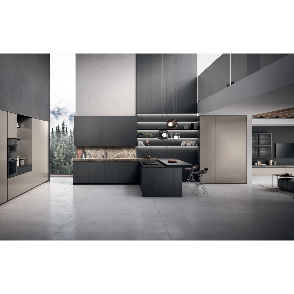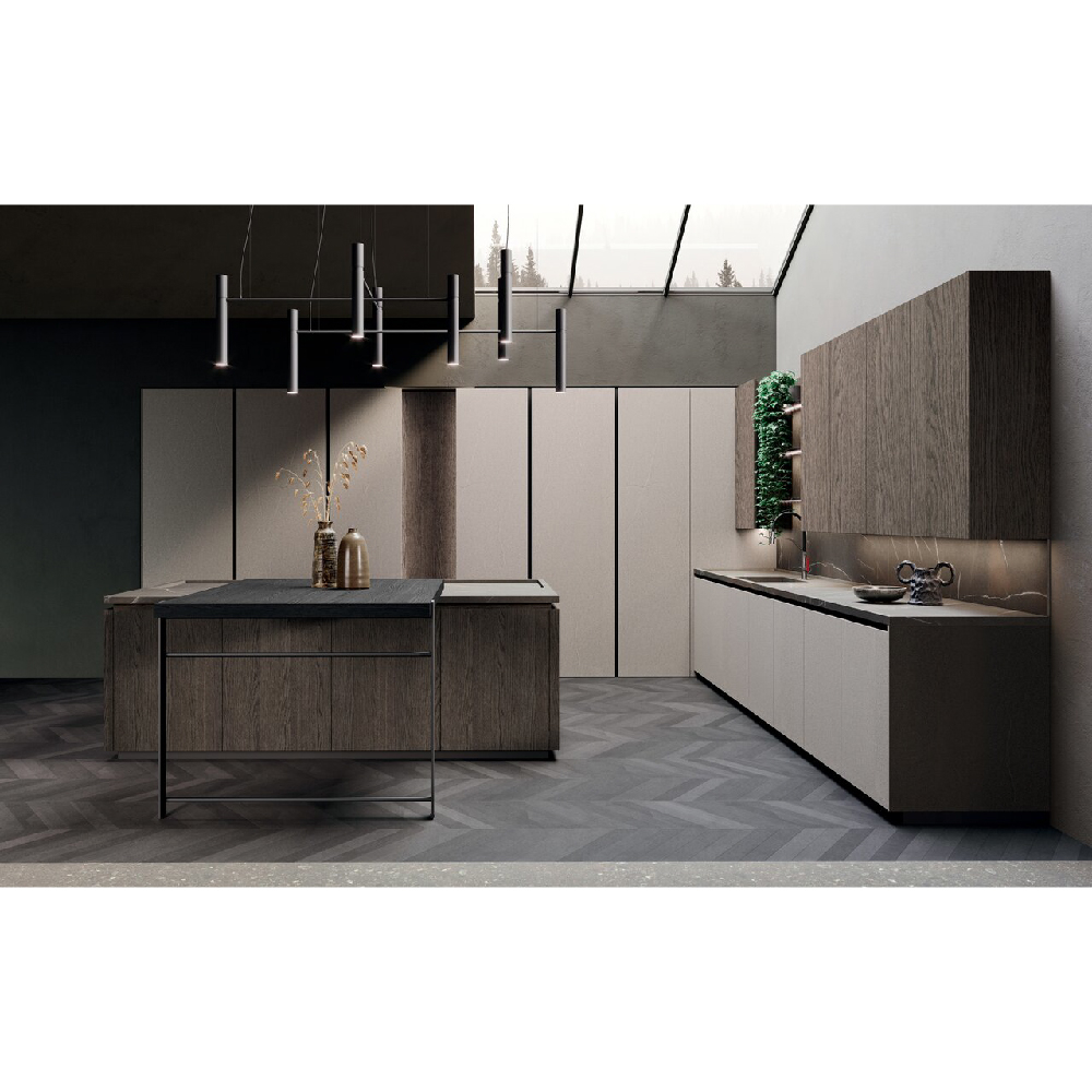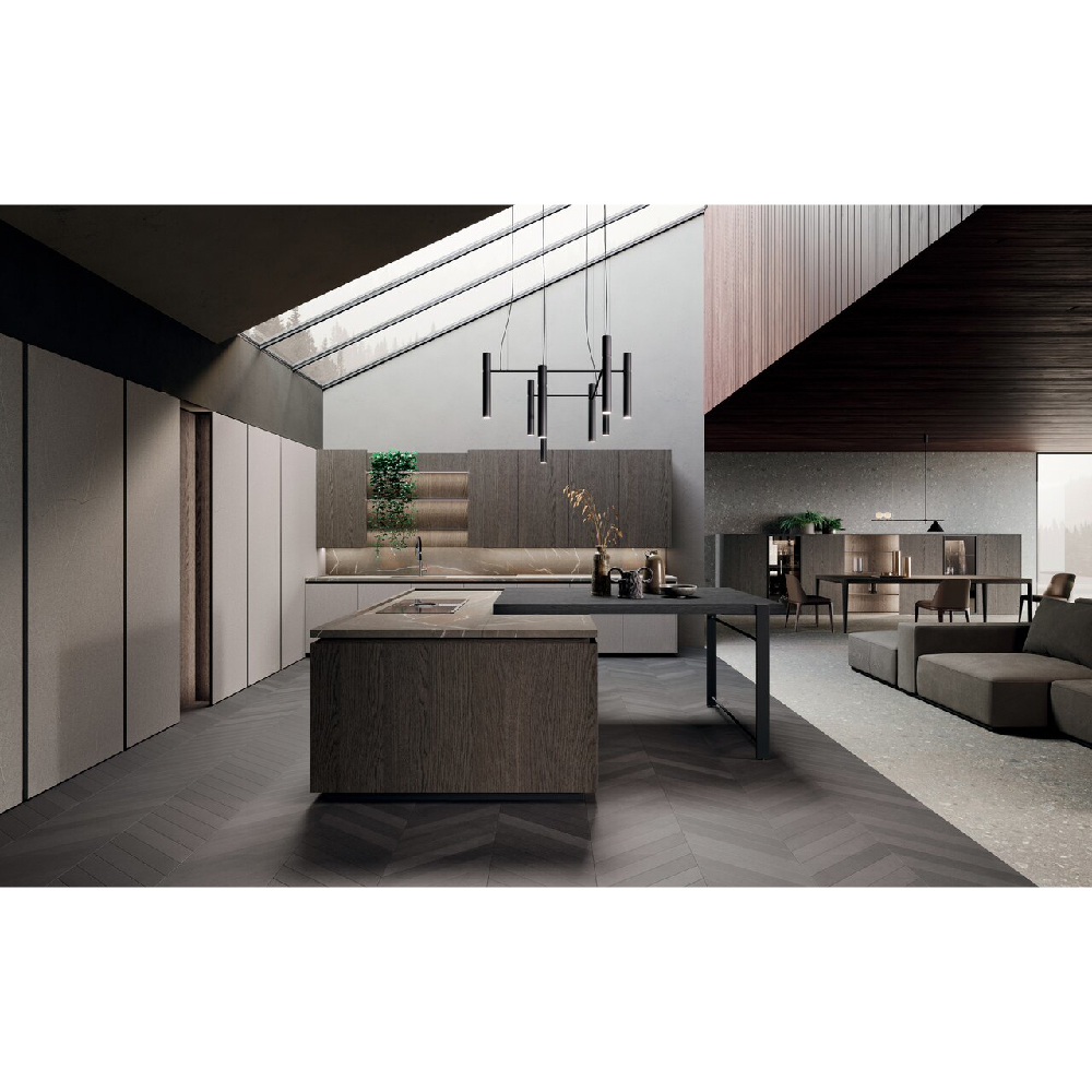 The idea of a convivial space is at the center of this project: an island with squared shape dominates the scene in an undisputed way. The square simbolize a comfortable shape, like an element around you can walk and spend every day of life in complete serenity, values also consolidated thanks to the snack plane that increases the meeting possibilities. The columns and wall units have 15 cm projecting doors relative to the structure that interrupt the monotony of the repeated fronts and at the same time allow a comfortable grip for opening, the empty areas breaks the balance and at the same time generates a library or simply a cone of light. Used materials have a classic flavor, a materic bilaminate Pietra piasentina is matched with Rovere grigio londra oak wood. To complete the environment, there is a living wall that retraces the same materials of the kitchen and which is enriched with Reflex wall units that give light and with staggered plans for a beautiful dynamins. As a background a table and low columns.