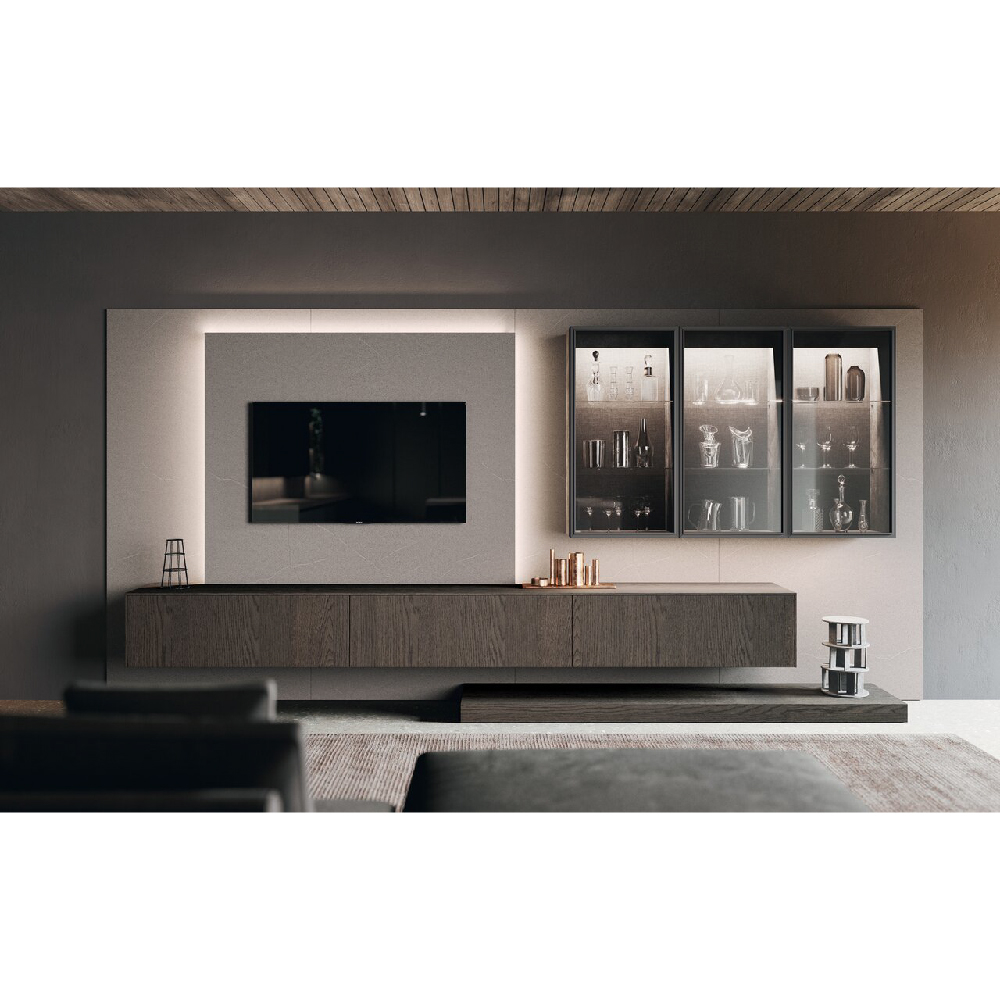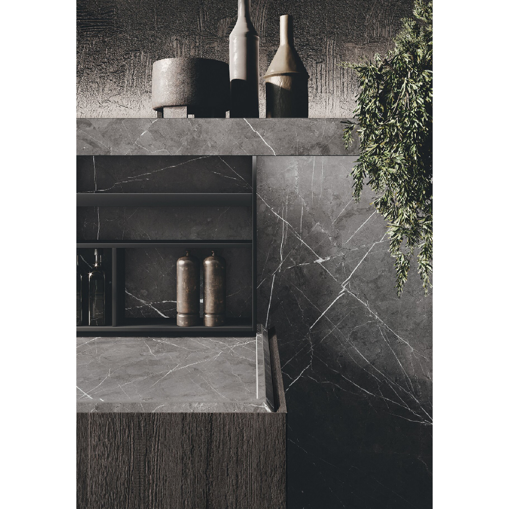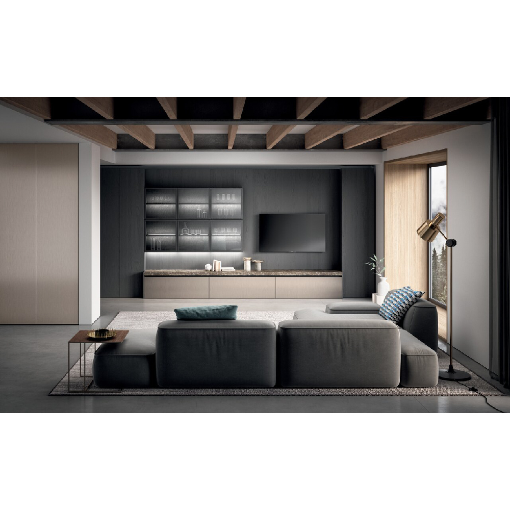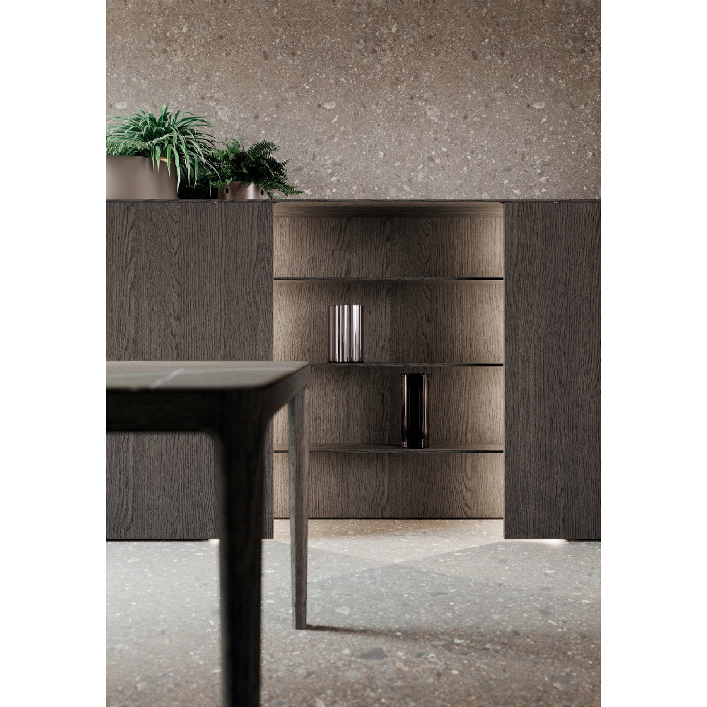 The idea of a convivial space is at the center of this project: an island with squared shape dominates the scene in an undisputed way. The square simbolize a comfortable shape, like an element around you can walk and spend every day of life in complete serenity, values also consolidated thanks to the snack plane that increases the meeting possibilities. The columns and wall units have 15 cm projecting doors relative to the structure that interrupt the monotony of the repeated fronts and at the same time allow a comfortable grip for opening, the empty areas breaks the balance and at the same time generates a library or simply a cone of light. Used materials have a classic flavor, a materic bilaminate Pietra piasentina is matched with Rovere grigio londra oak wood. To complete the environment, there is a living wall that retraces the same materials of the kitchen and which is enriched with Reflex wall units that give light and with staggered plans for a beautiful dynamins. As a background a table and low columns.