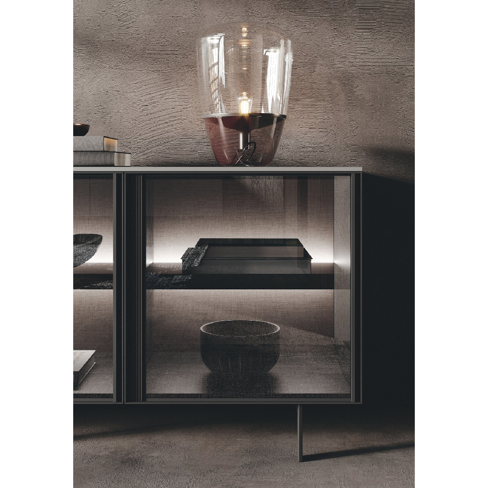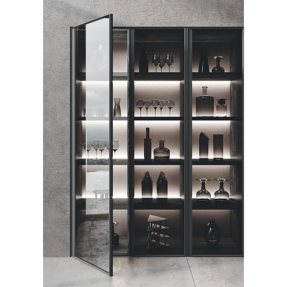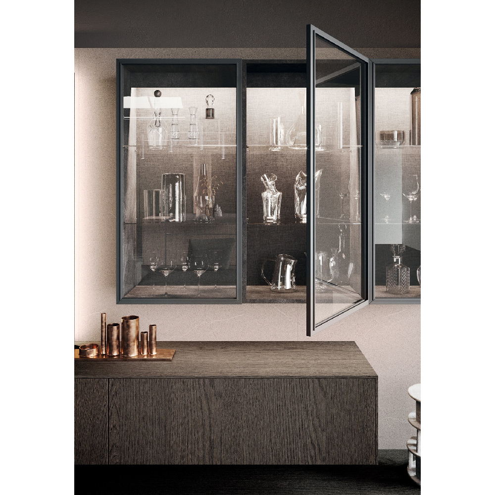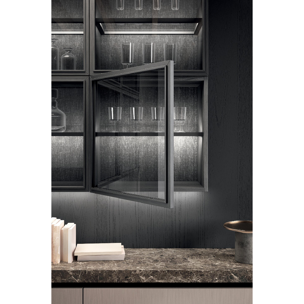 Detail of base units in tech alluminio champagne finish and wall units with reflex glass doors made in black aluminum frame and fumè glass, back panels and columns are in wood rovere carbone finish. |