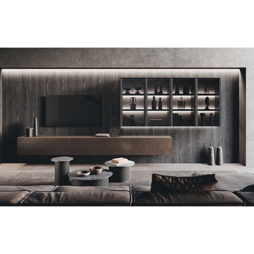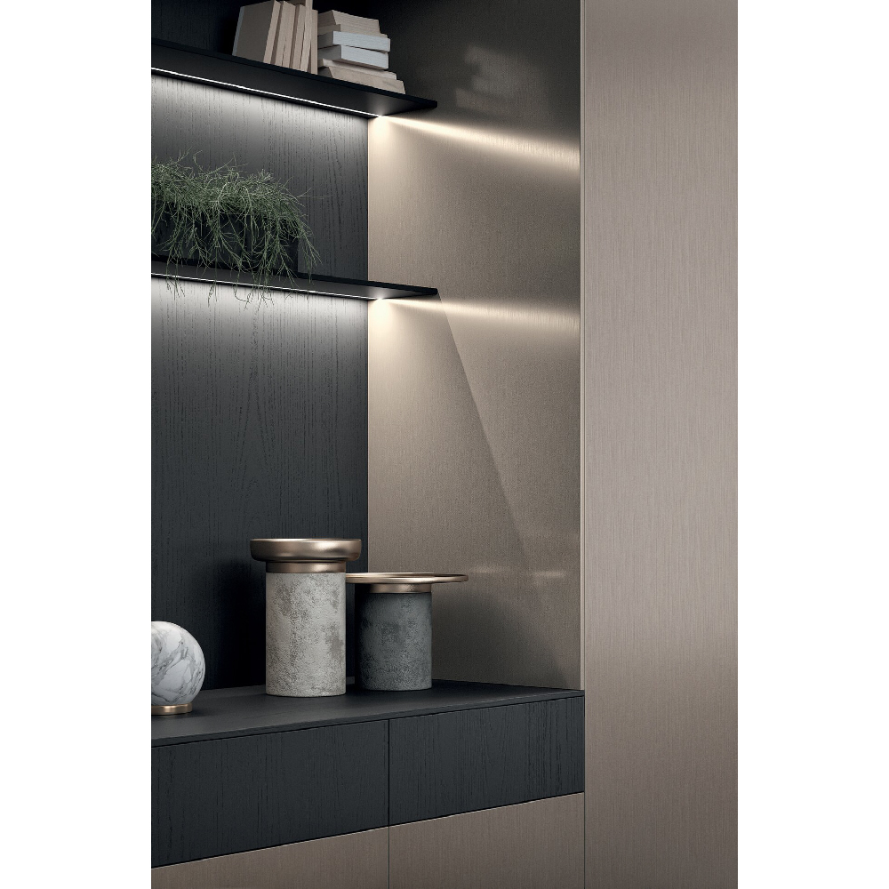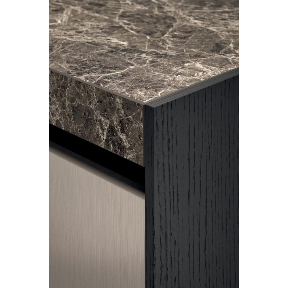 Detail of sideboard with Bluna tech doors aluminum champagne finish and elle groove in matt black finish. Side panels in wood rovere carbone finish. Top in matt gres emperador finish. |