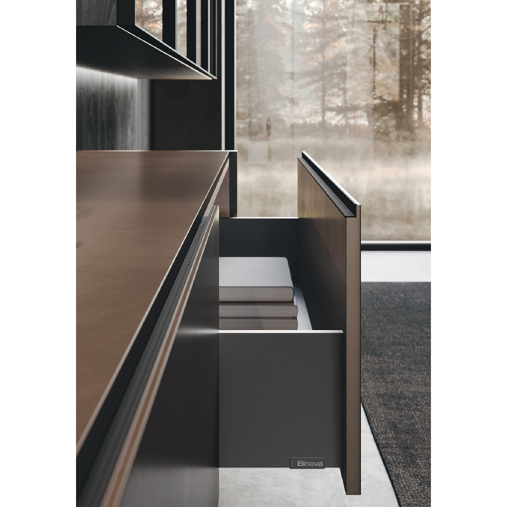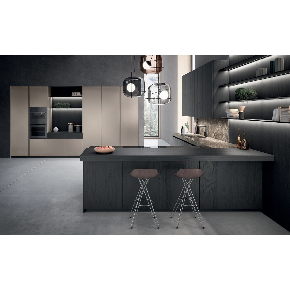 A project that allows to rediscover the pleasure of living a rich and warm kitchen environment. A truly professionally inspired laboratory with all the accessories and equipment useful for the preparation of food, as well as details of a refi ned decorative product which further enlarges the already vast offer of exclusive worktops on the part of Binova. The matericity of natural wood for a pleasant aesthetic and tactile sensation, column doors in tech aluminum finish are matched with base and wall units in oak wood Rovere carbone finish, a set of high-tech materials, which contribute to creating a unique product of its kind. A large peninsula acts as a watershed between the column area and the living area. The whole project is centered on the theme of specular openings, if the kitchen has a central wooden boiserie, the columns have a central compartment suitable for containment of small appliances and finally the living wall show at the center glass units and wooden back panels.