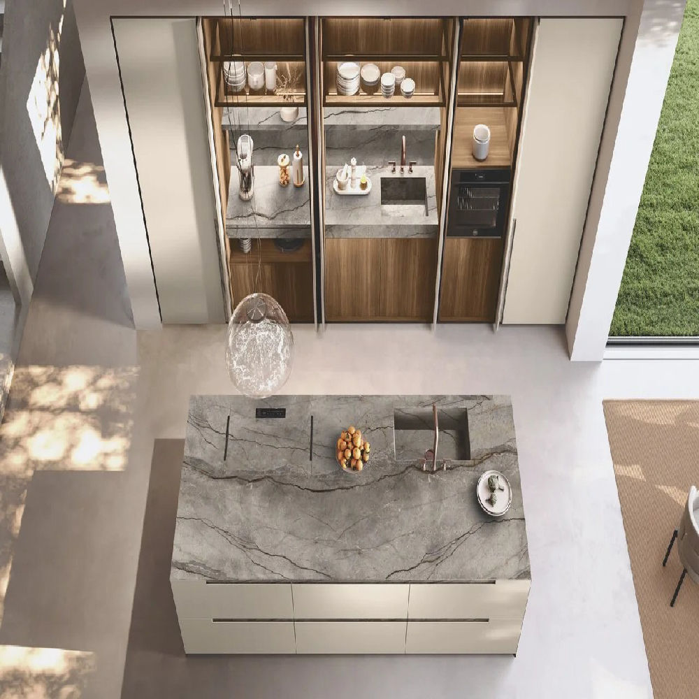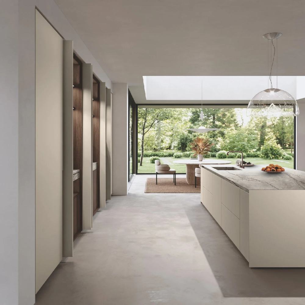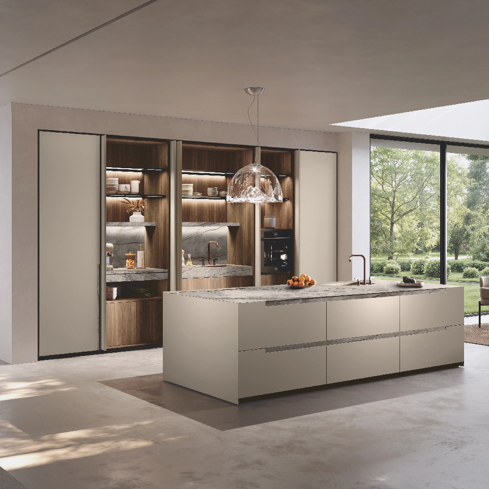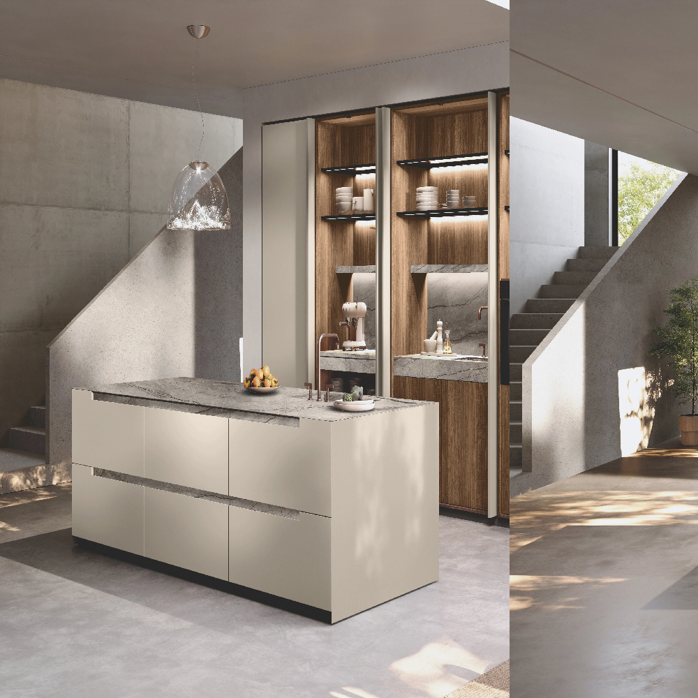 The Bluna island is characterised by its refined monolithic volume that places emphasis on simplicity and cleanliness of lines. The distinctive Stone handles, designed as horizontal sections inserted in the upper edge of the fronts, and the elegant stoneware worktop in matt Silver Root ease the rigor and decorate the aesthetic purity of the surfaces. As in the theatre when the curtain rises, when the wall columns open, a horizon of revelations unfolds, multiplying spaces and functions. The columns hide unexpected solutions such as practical pull-out worktops, washing areas and appliances. As soon as the doors close, the boundaries of order are restored.