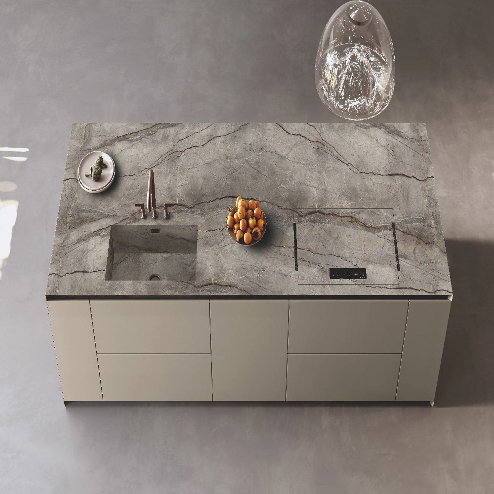 Detail of Bluna door in matte lacquered Beige Kenia with a mini slide profile and Stone handle, 6mm thickness in matte Silver Root gres. Worktop 12mm thickness and mini slide profile in matte Silver Root gres, with a gres sink built in the same finish.