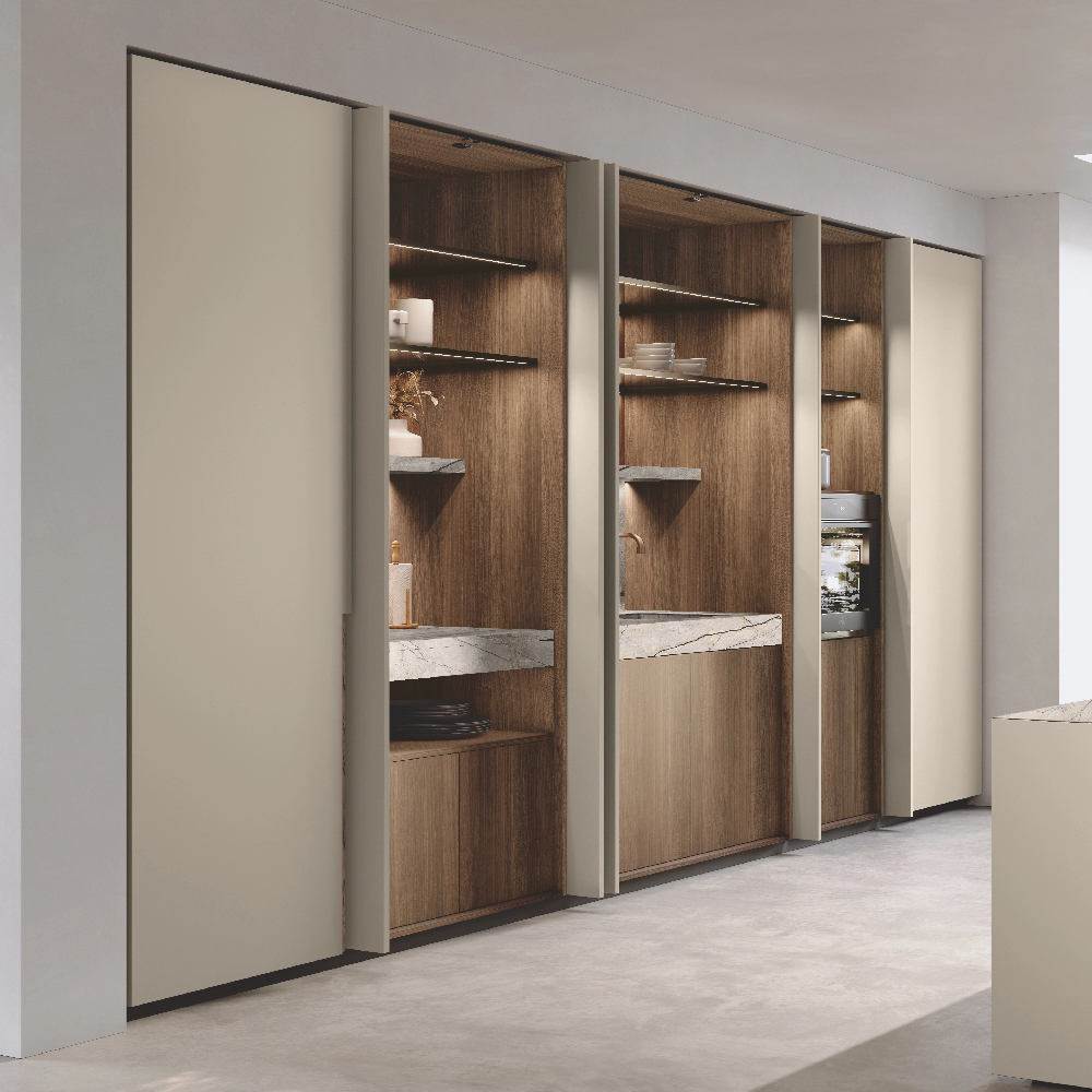 Bluna columns in matte lacquered Beige Kenia. Structure finish of the columns with retractable side doors in Noce Americano bilaminate wood. Shelf 5 cm thick, sliding top and fixed top in matte Silver Root gres.