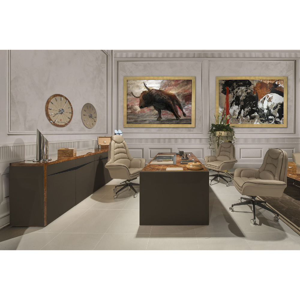 Leather Daino col. Fudge & perforated leather, piping in leather Daino col. Chestnut, printed bull logo on headrest, lacquered base black matt.