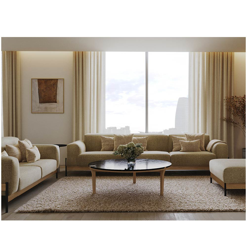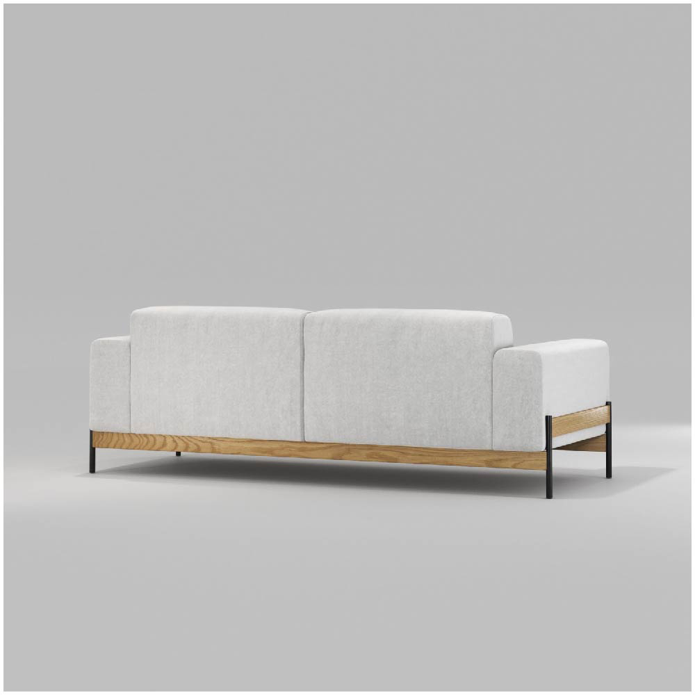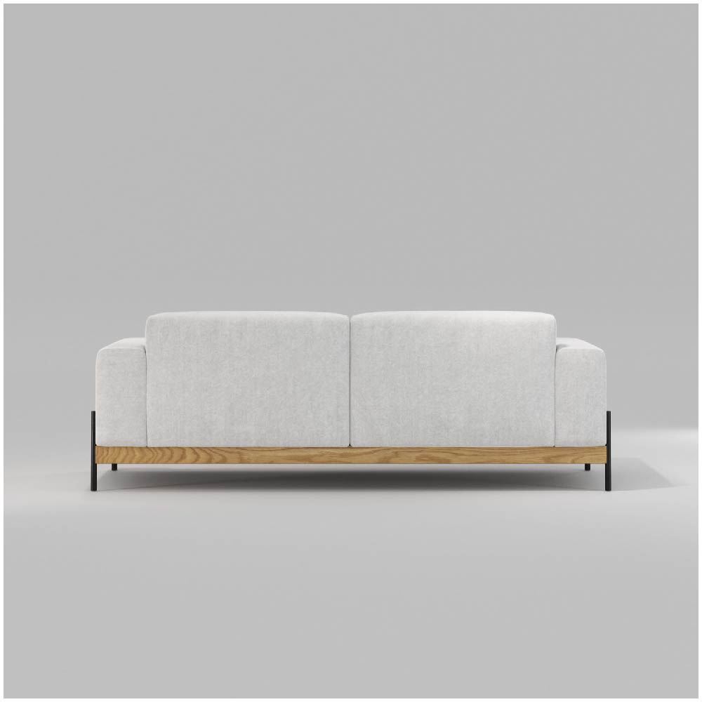 The Bowie sofa seamlessly blends contemporary design with lasting comfort, offering a striking balance between lightweight metal and the enduring strength of solid wood. The clean lines and minimalistic silhouette are enhanced by a simple yet captivating detail, the junction where the metal frame meets the wood, creating a refined contrast that adds visual interest without overpowering the overall design.
