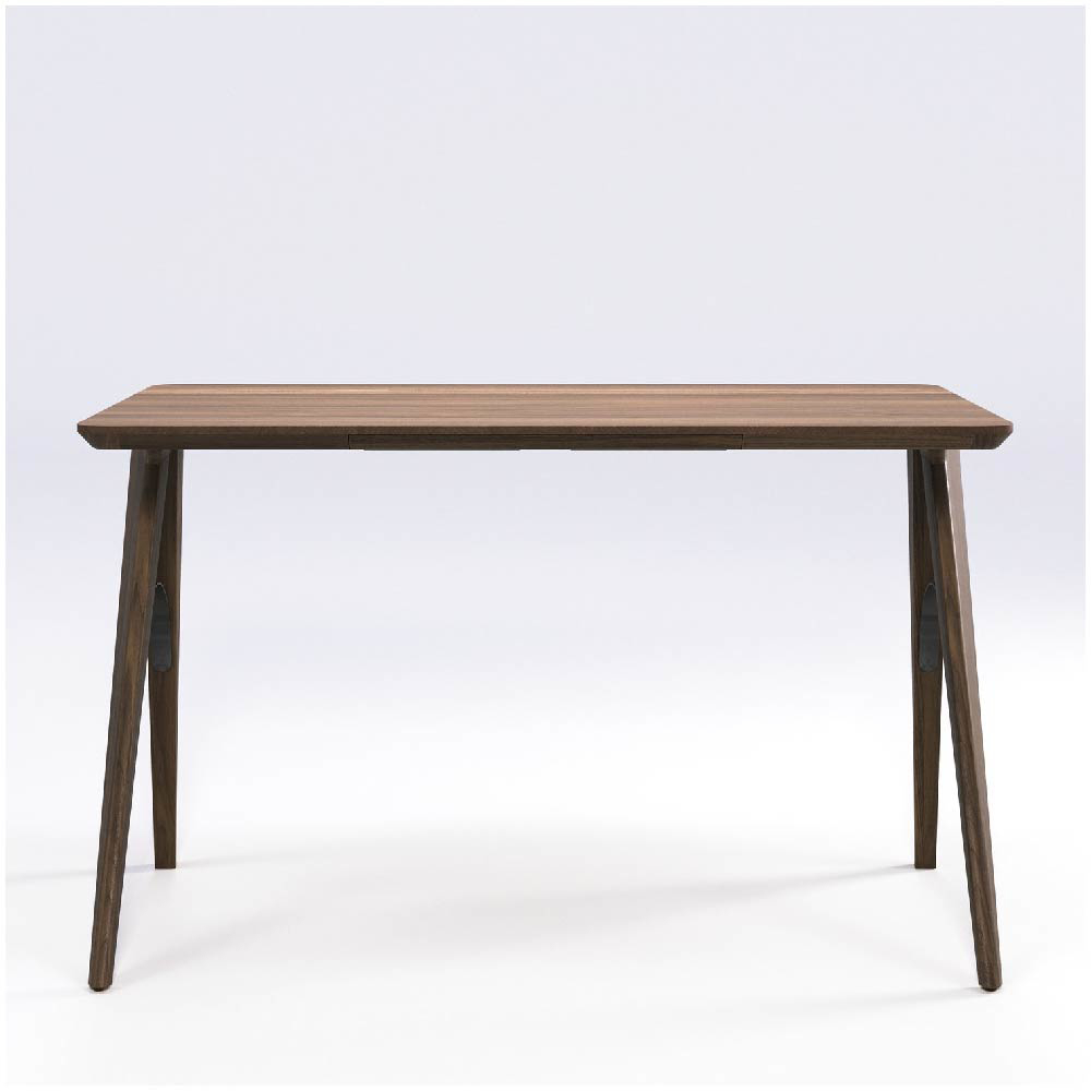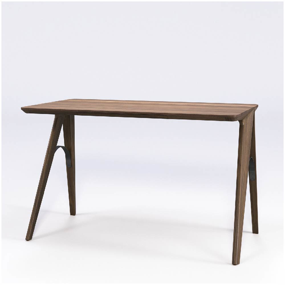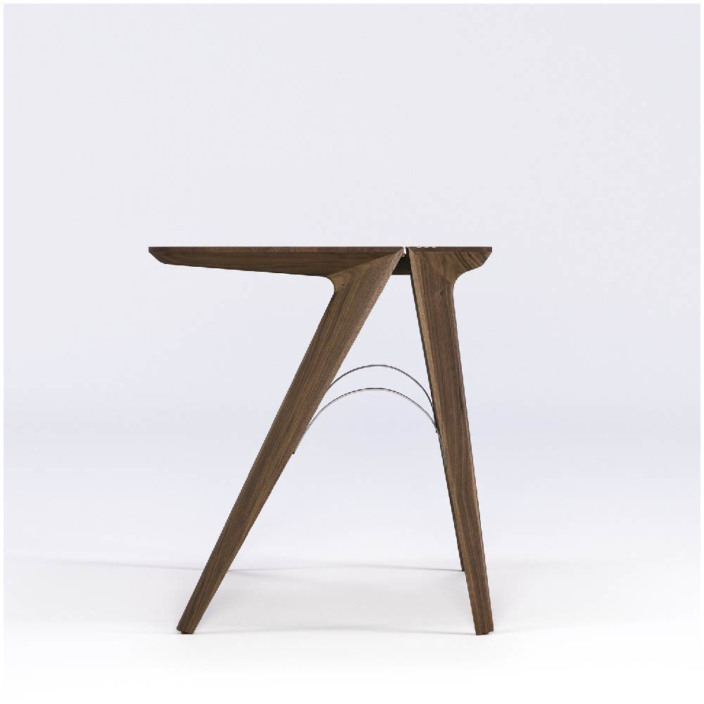 It is made from oak or walnut with steel arcs that span the legs, much like the structures you’d find on the bridges in Porto. This unique blend of natural wood and industrial steel creates an aesthetic that is both grounded and elevated, evoking a sense of architectural elegance and resilience. The carefully chosen materials not only offer durability but also exude warmth and sophistication, adding character to any workspace.