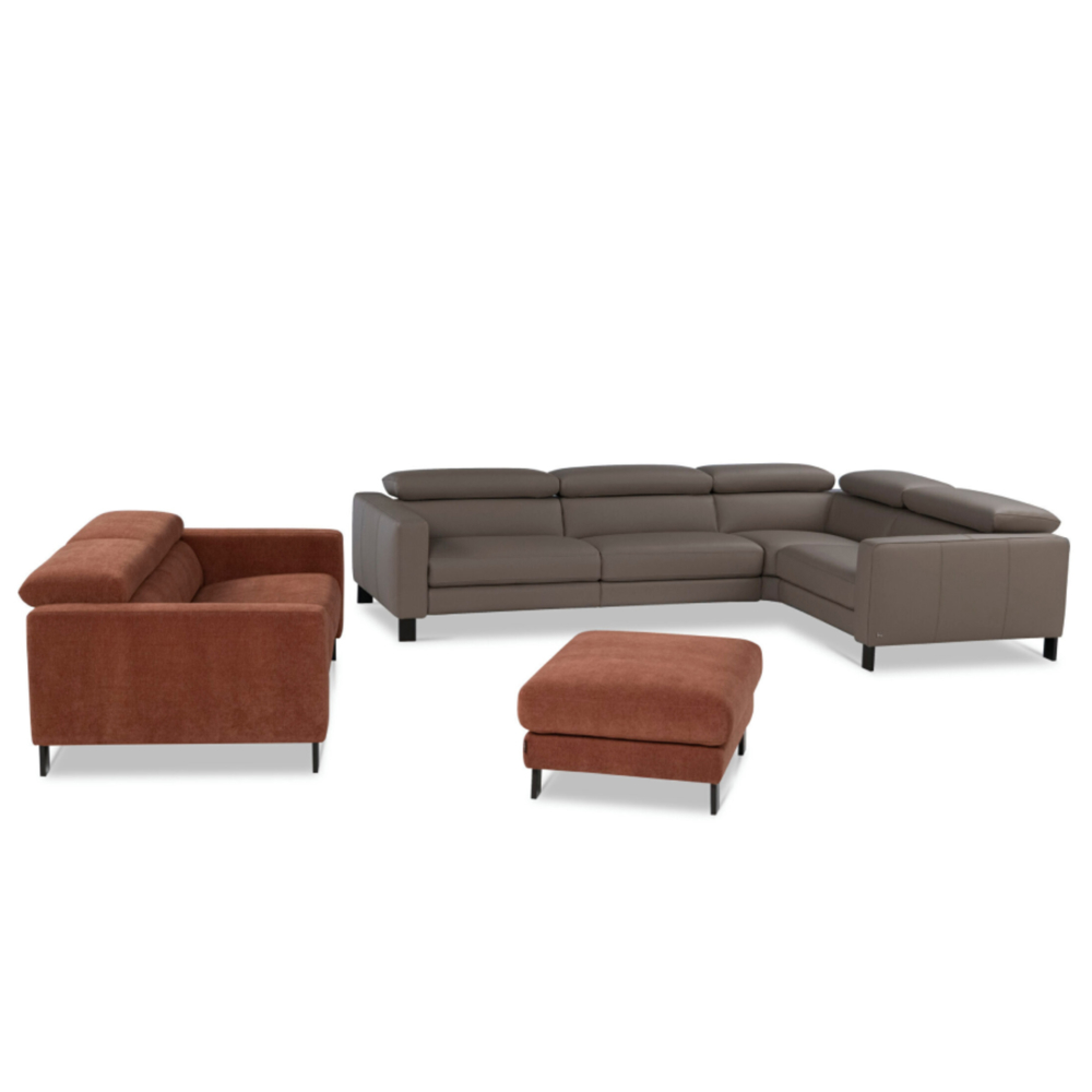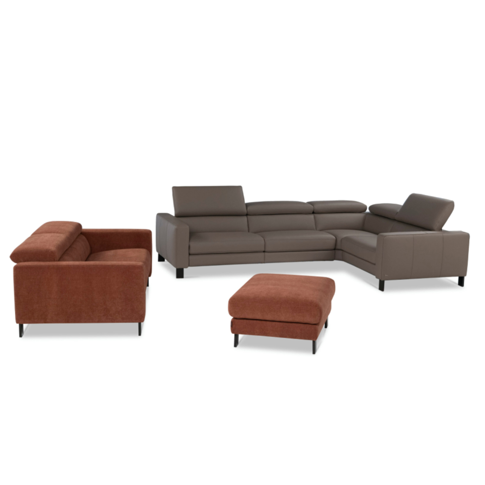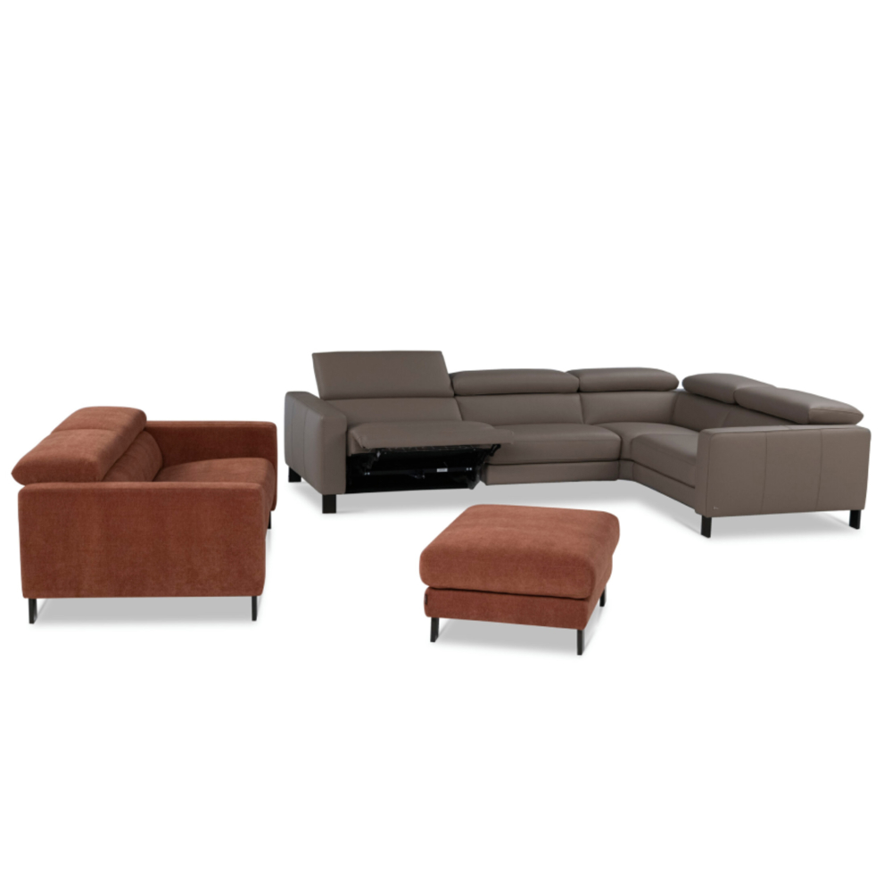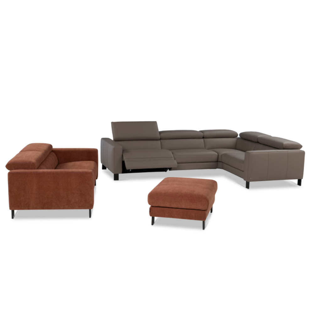 Mechanisms: the model is equipped with headrests that can be manually lifted on all versions. Electric recliner versions equipped with electric recliner mechanisms operated through a TOUCH PAD positioned on the internal sides. The depth of the model with open recliners is 148 cm. The height of the model with lift-up headrests is 94 cm.