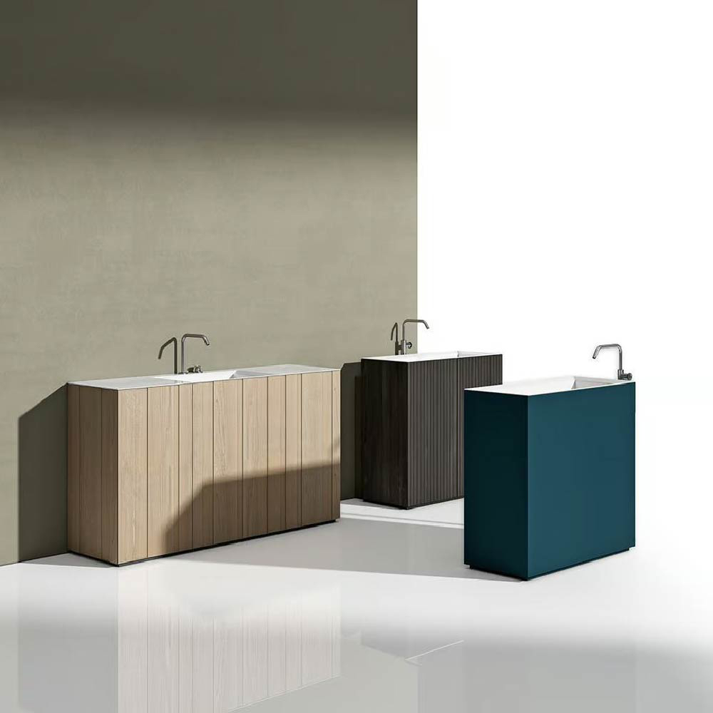 In addition to maximizing the sink space, even in low depth furniture, CHRONO 14.96"/17.32" offers the possibility to easily adapt the exclusive basins of this collection, adapting them to different needs of positioning the tap. Depending on the space and the refined style, you can ask for the solution with wall tap, with hole on the top or in a free-standing monobloc solution.