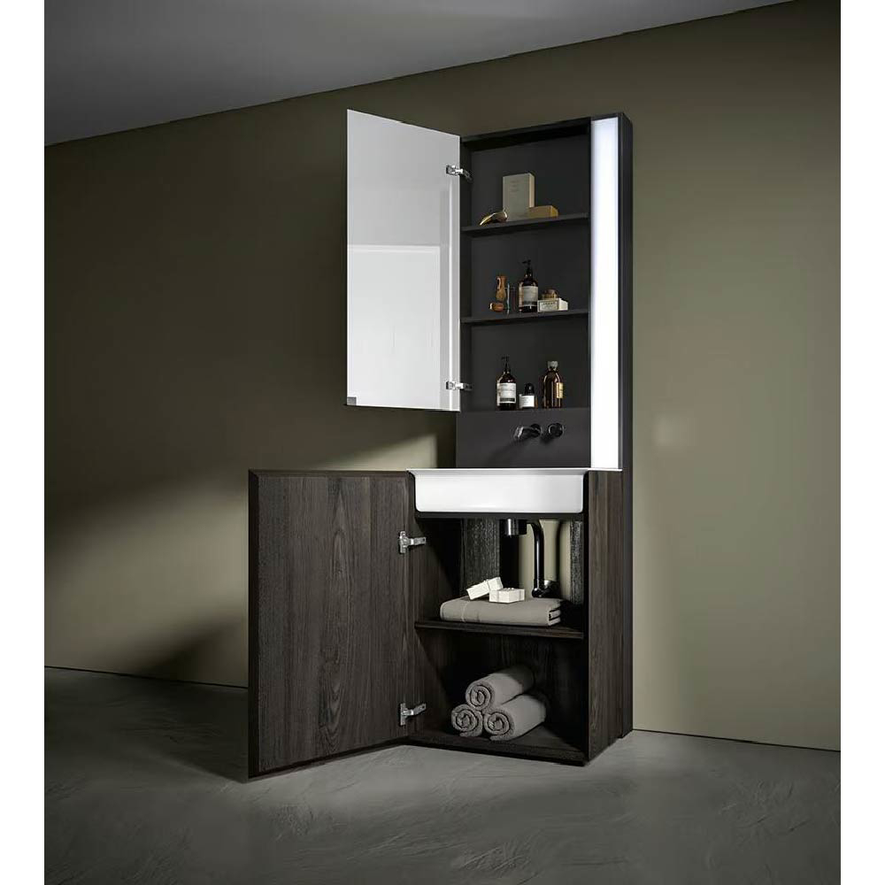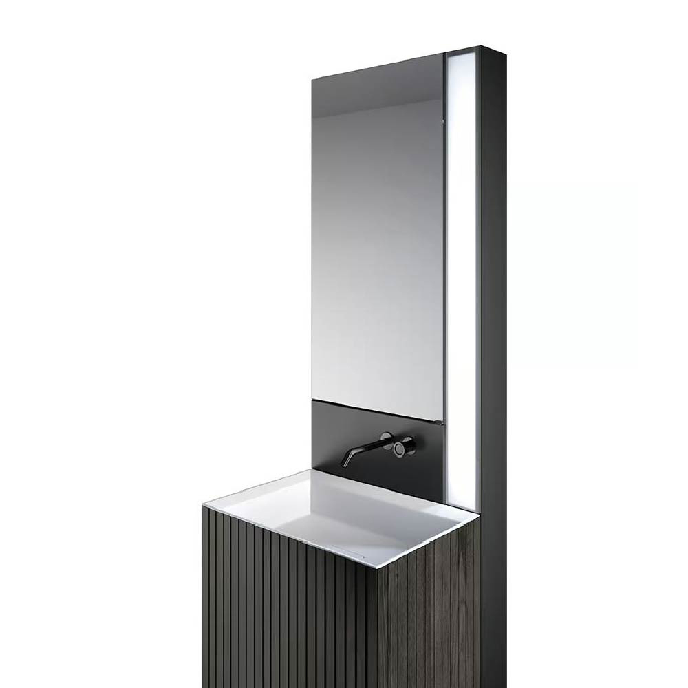 Maximizing the space of vanity units with reduced depth: this is the mission of Chrono14.96"/17.32". Thin profiles, clean and essential lines designed to fully exploit each centimeter of surface, also on vanity units with reduced depth. Moreover, Chrono14.96"/17.32" allows to chose among 3 different mixer positions.