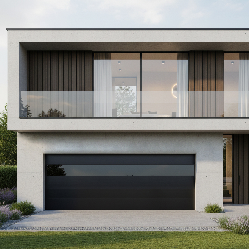 The infinity horizontal glass design creates a sleek, continuous visual line that enhances the modern appearance of the door while allowing natural light into the garage. The black tempered safety glass is treated with a spot-free nano-coating, offering impact resistance, fingerprint resistance, and easy maintenance. Finished in dark grey, the door provides a refined, contemporary look ideal for homes, apartments, villas, and other modern architectural projects.