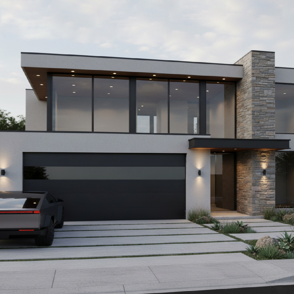 The infinity horizontal glass design creates a sleek, continuous visual line that enhances the modern appearance of the door while allowing natural light into the garage. The black tempered safety glass is treated with a spot-free nano-coating, offering impact resistance, fingerprint resistance, and easy maintenance. Finished in dark grey, the door provides a refined, contemporary look ideal for homes, apartments, villas, and other modern architectural projects.