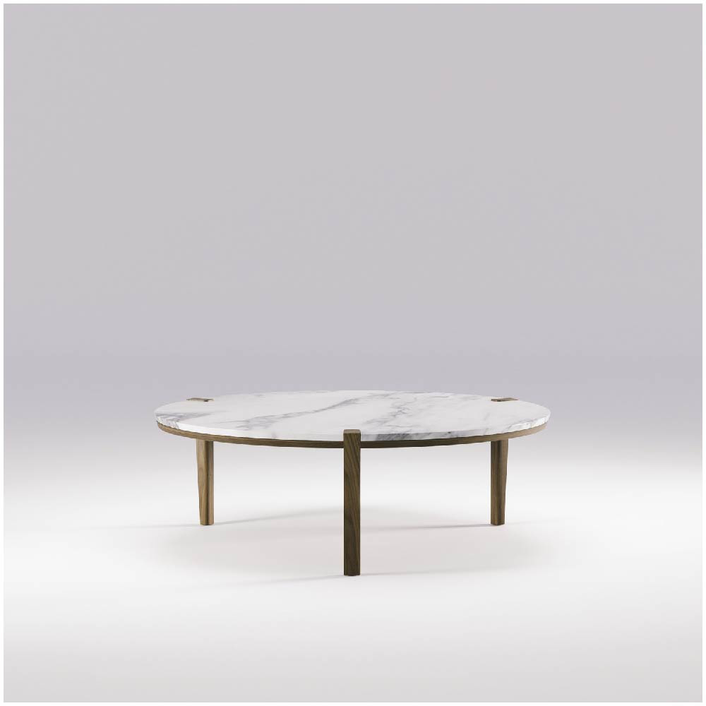 A key feature of the Corner tables is the meticulous assembly detail that can be found in both its rectangular and round versions. This connection between the foot and the top of the table accentuates the contrast between the smooth, polished marble and the solid wood, highlighting the craftsmanship and structural integrity of the piece. The blending of these materials adds a rich texture to the design, creating a striking visual contrast that enhances its overall elegance and presence.