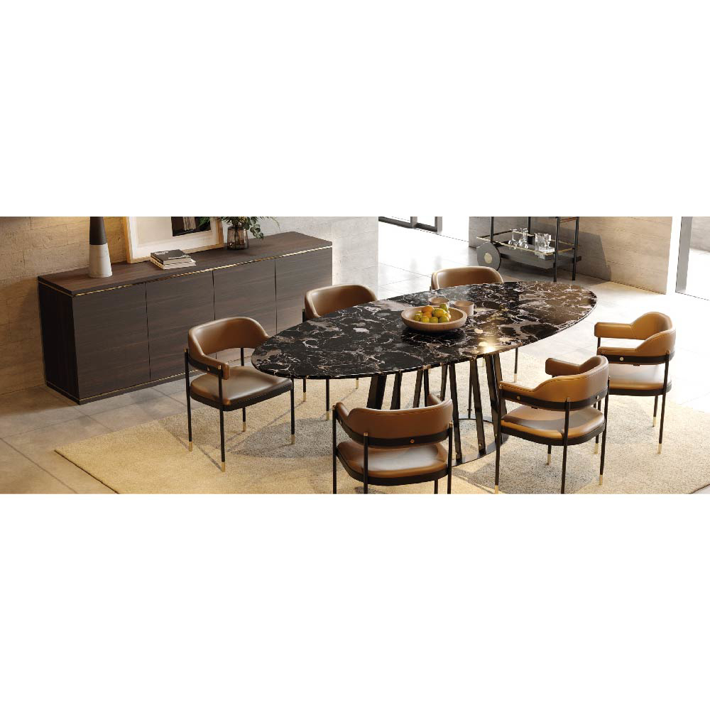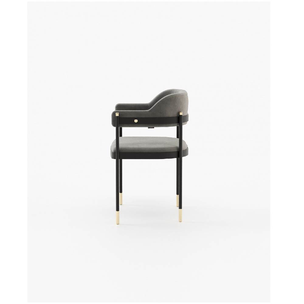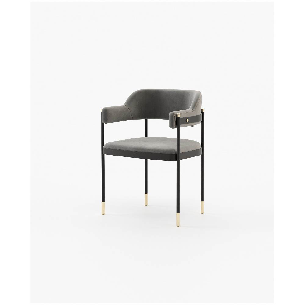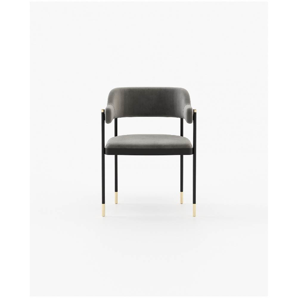 The Dale chair is a stunning seating piece that combines contrasting materials and geometric forms for a bold and functional design. With a convex back and armrest, a metal structure and feet, and a smooth fabric seat and backrest, it is perfect for bold dining rooms or other open settings.