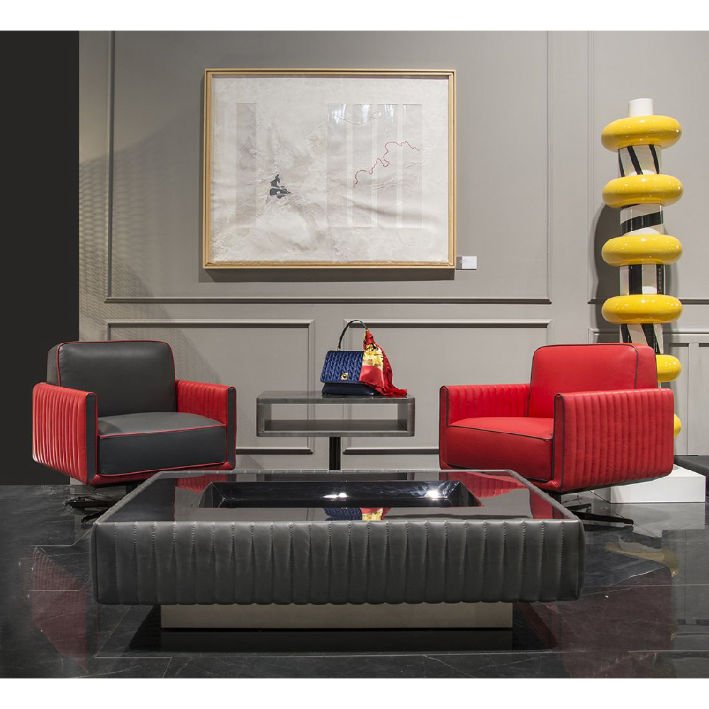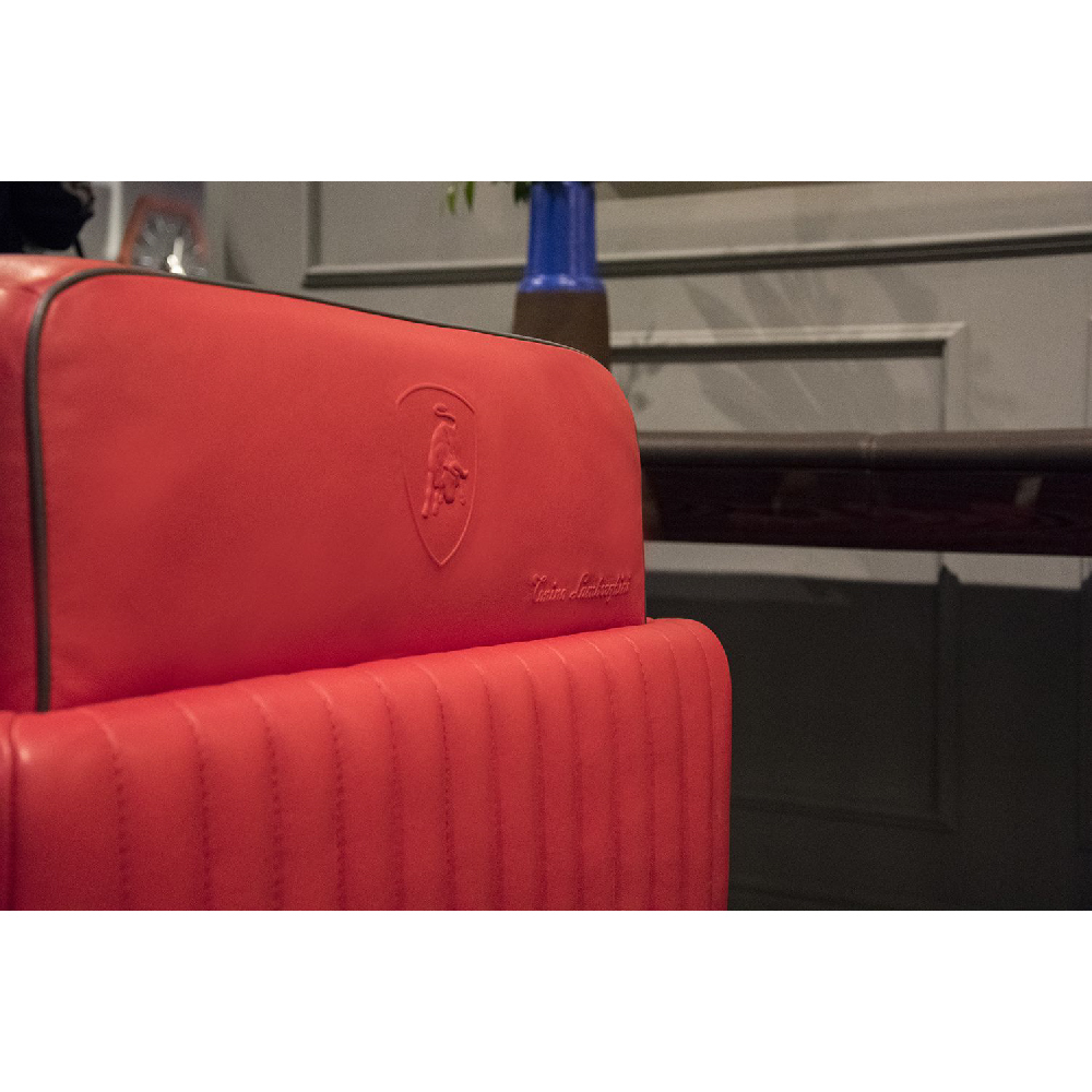 All in leather Daino col. Red with vertical stitching on the structure, piping in leather Daino col. Graphite, metal base lacquered col. titanium glossy.