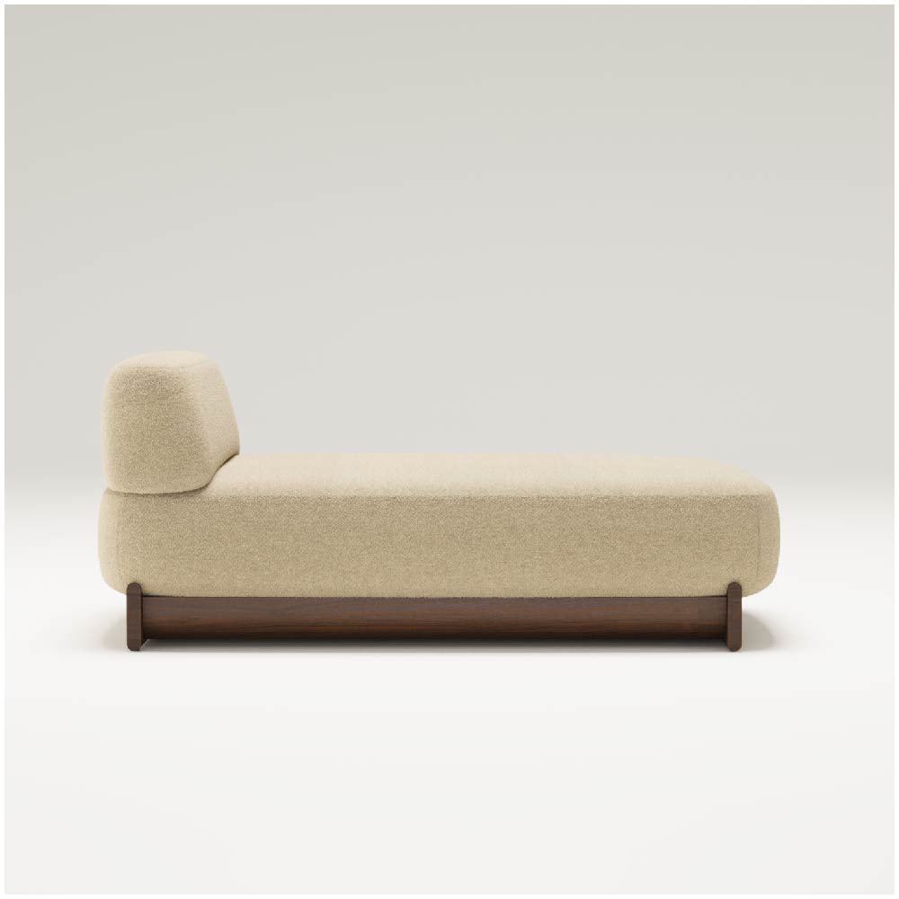 The round, voluminous upholstery invites relaxation, evoking a sense of warmth and comfort, while its meticulous craftsmanship and plush materials deliver an elevated tactile experience. This inviting softness is thoughtfully counterbalanced by the geometric precision of the solid wood base, an architectural element that grounds the design with strength and clarity.