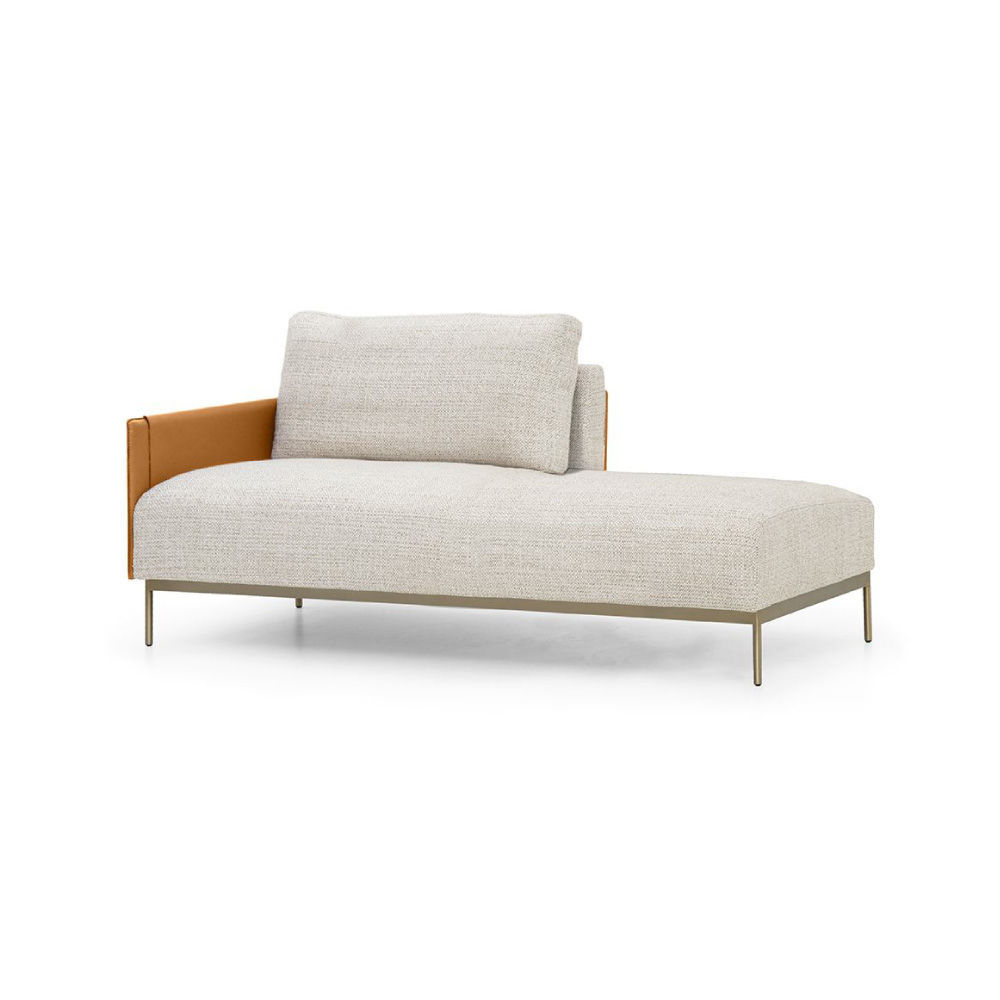 Structure & flaps in Cuoio leather col. Kestral Tan, cushions in fabric Spiga col. 1, metal structure & metal buttons with AM logo in light gold finish.