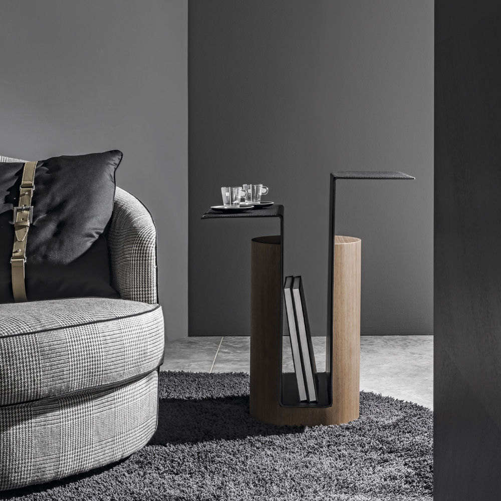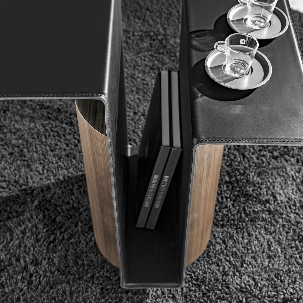 The Etna coffee tables is a contemporary collection of cocktail table featuring curved and cylinder wood. The magazine rack with saddle top is a real statement piece. Available in all MC colors
