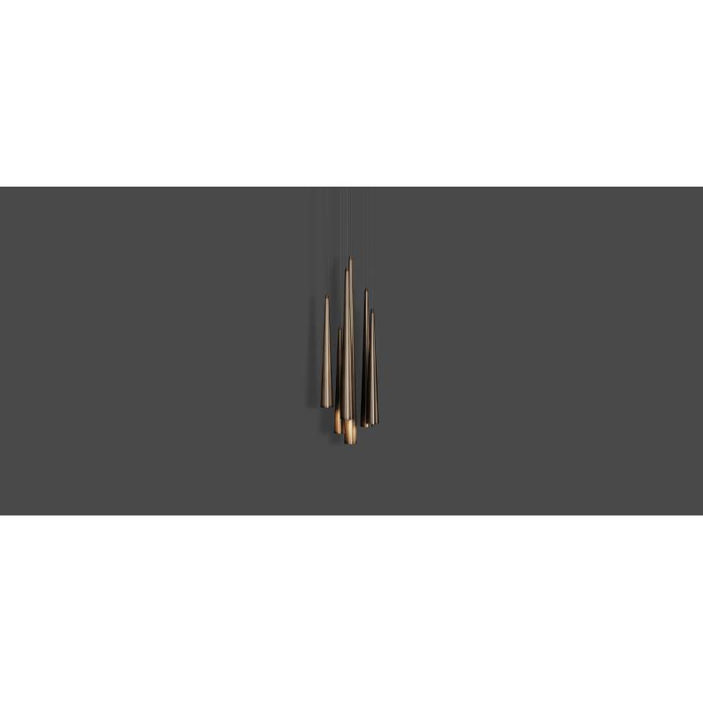 Long and harmonious brass cones that hold the light bodies are the elements that make Firlinfeu a unique and highly recognizable lamp. Taken individually or in multiple configurations, these brass elements manage to furnish the space in a refined and scenographic way.