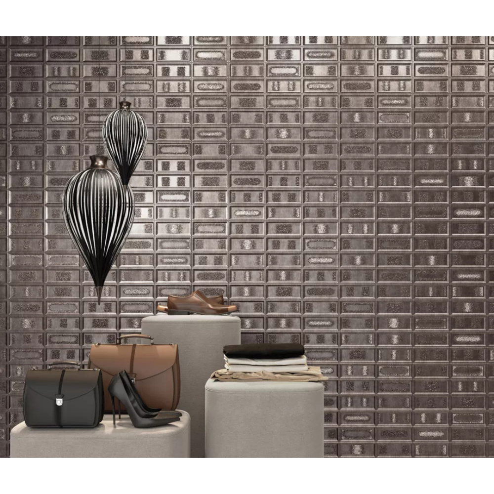 • 20”x40” with embossed brick reliefs and tonal gradients for depth and modern character