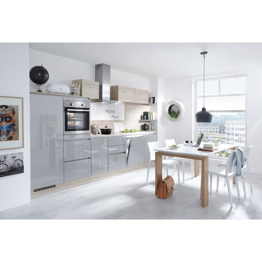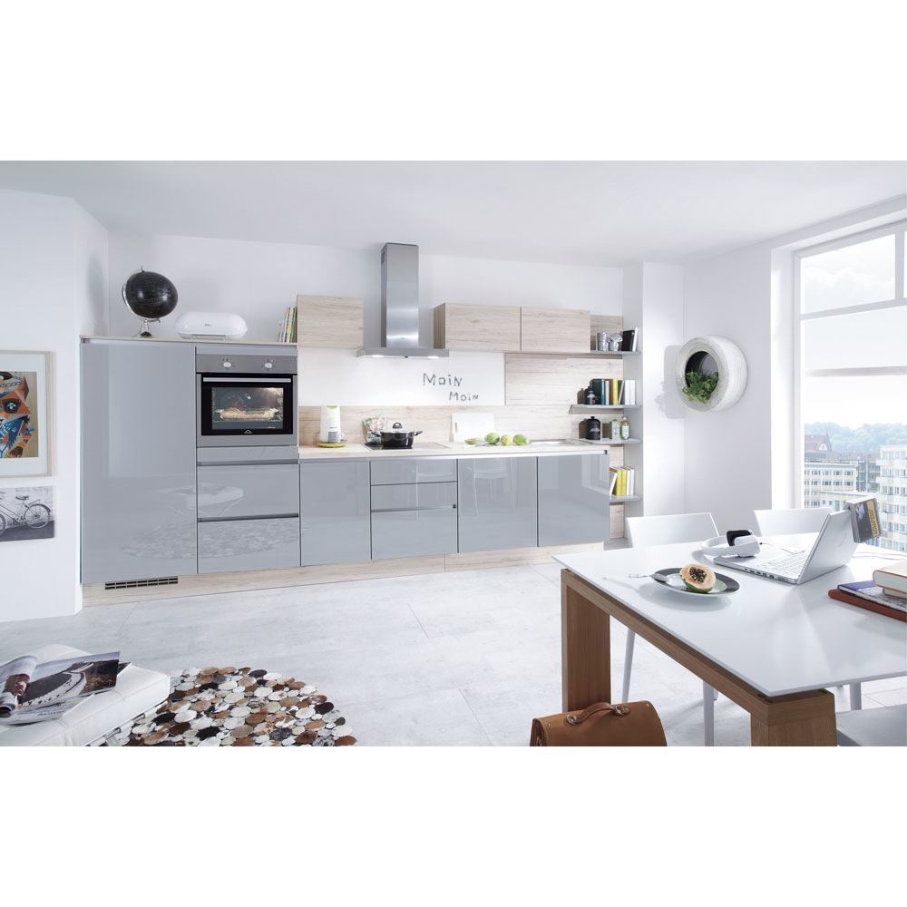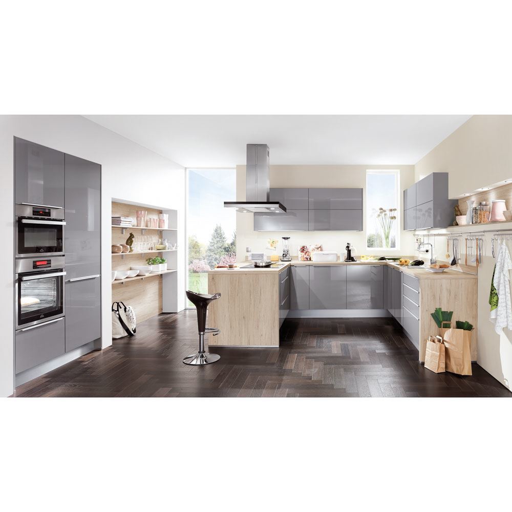 Technology that whets your appetite for cooking. Compactly planned lacquer kitchen in a U-shape with ultra high gloss fronts in Mineral grey. The accents in Sanremo oak reproduction also create a cosy atmosphere.