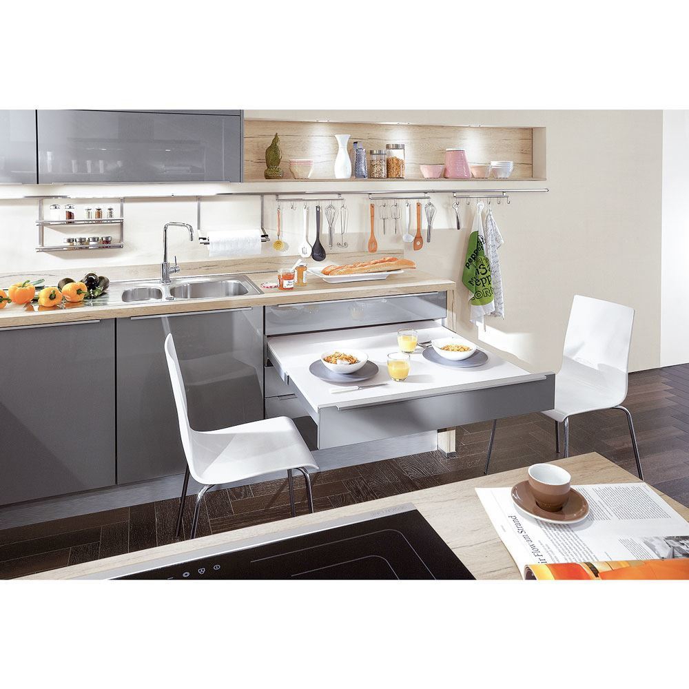 The wall units are universally outfitted with modern folding/lifting technology, which makes space-saving opening possible. Optionally, wall units can also be equipped with the electronic Servo Drive opening mechanism.
