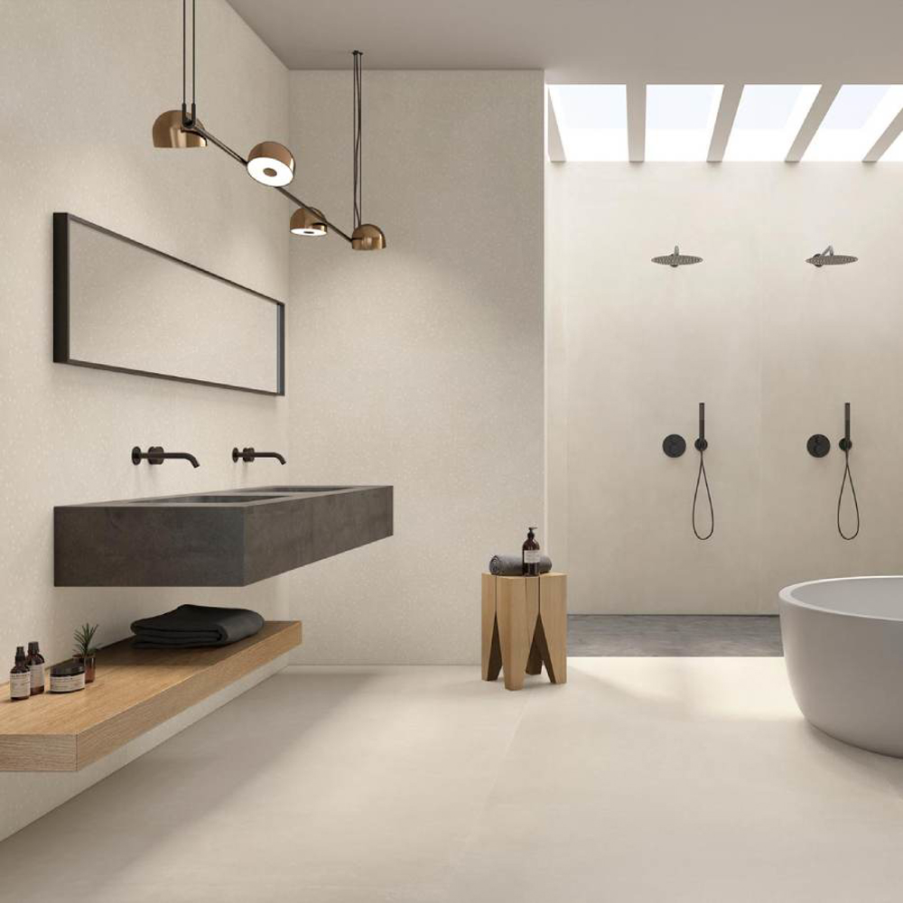 Discover its complete adaptability to flooring, cladding, indoor and outdoor spaces thanks to its 47,2"x110" large-format and 1/4" thickness.