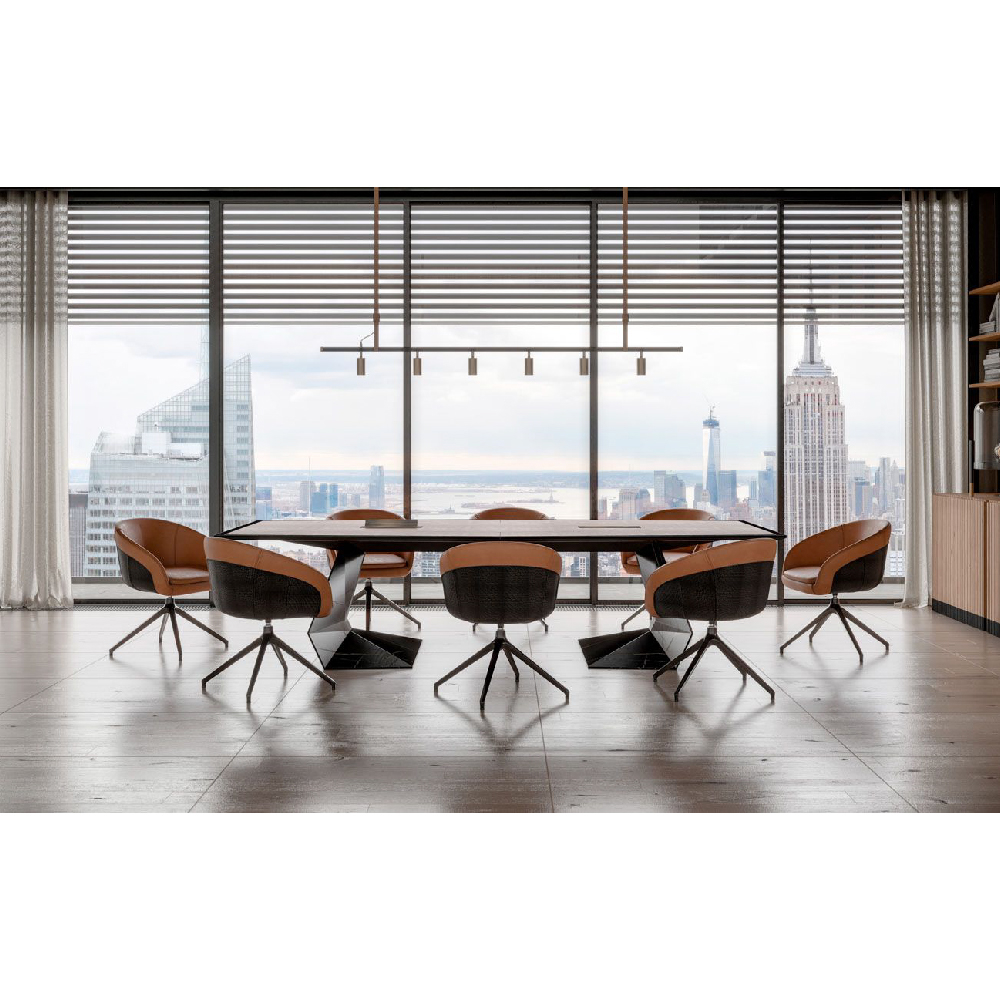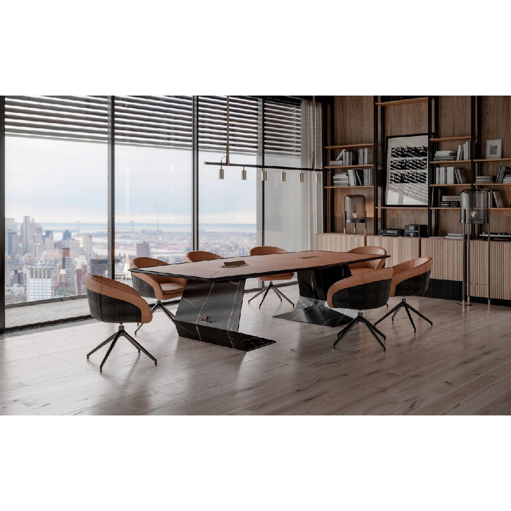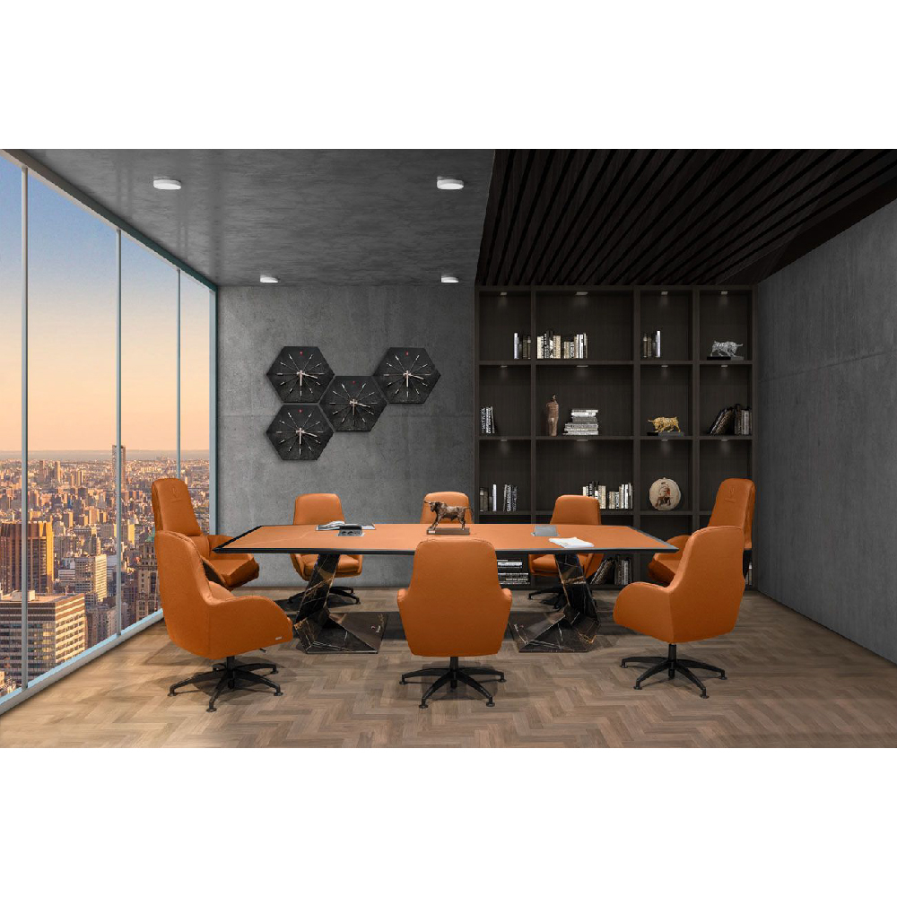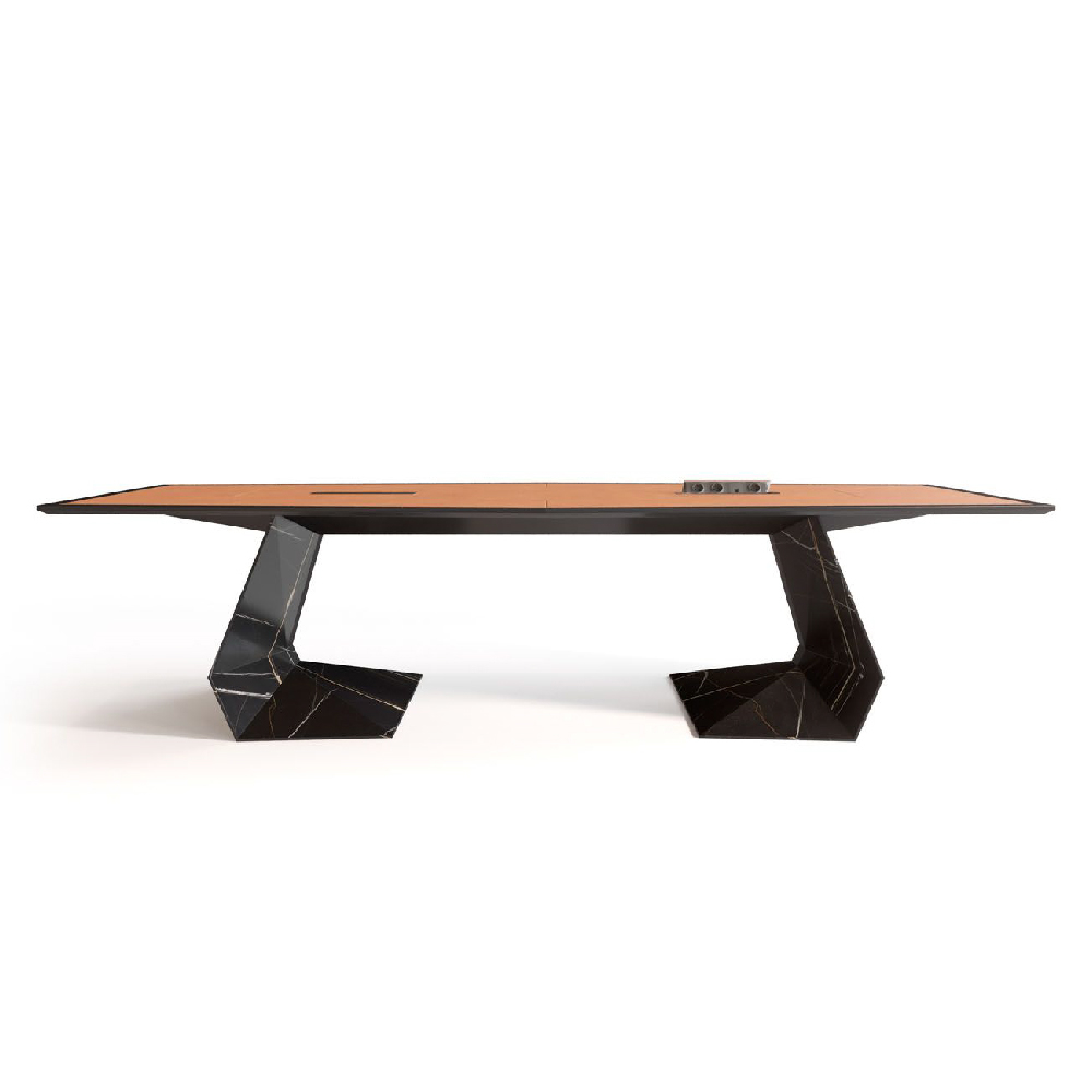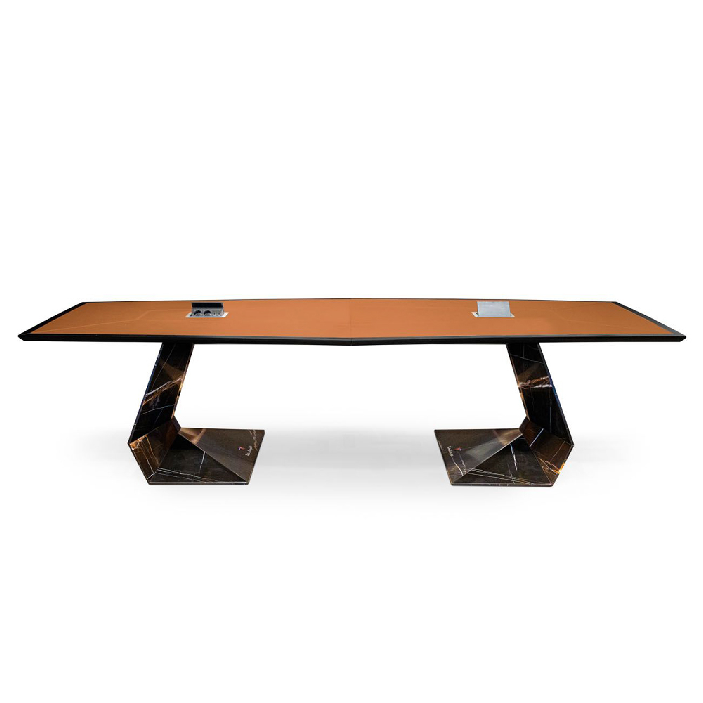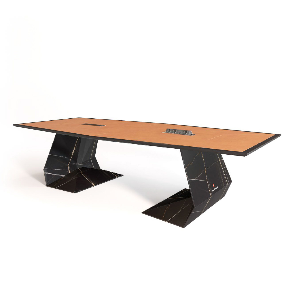Top in leather Daino col. Whiskey, contrast stitchings, with 2 multiplugs, legs in Sahara Noir marble, metal logo col.nickel/red shield.