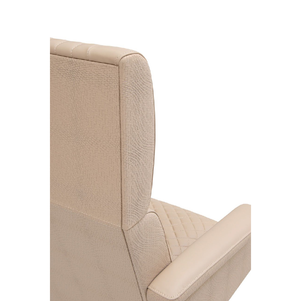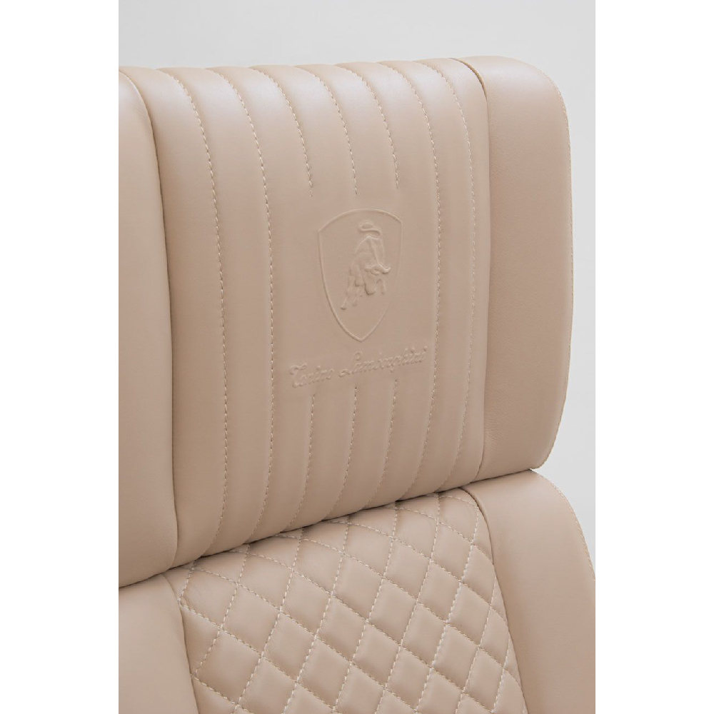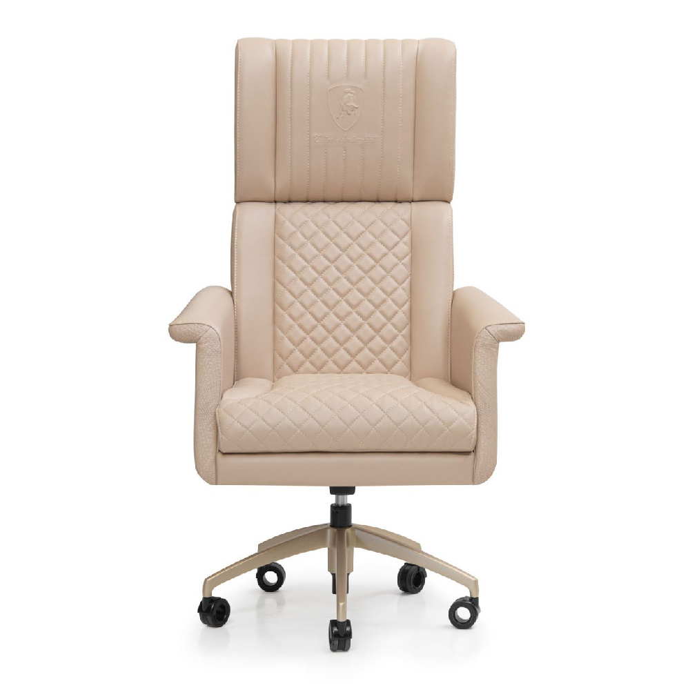 Internal upholstery in leather art. Daino col. Fudge with canneté and embossed TL logo on headrest, backrest and seat with matelassè, tone on tone stitchings, sides and ouback with “Bricks” printed leather art. Daino col Fudge, tone on tone stitchings. Metal base with Black wheels, adjustable height mechanism & oscillating mechanism in Pale Gold matt finish.