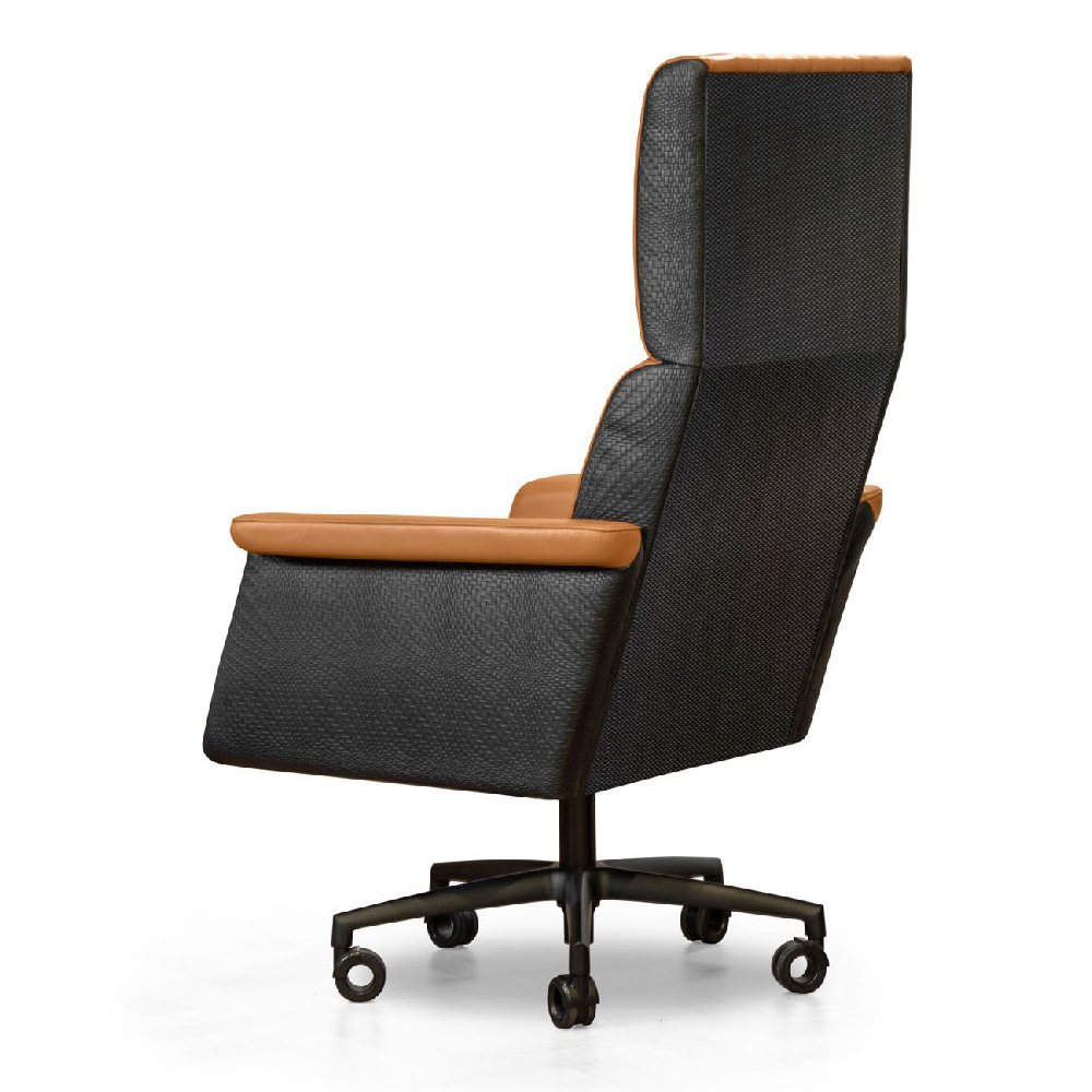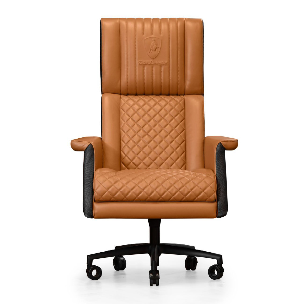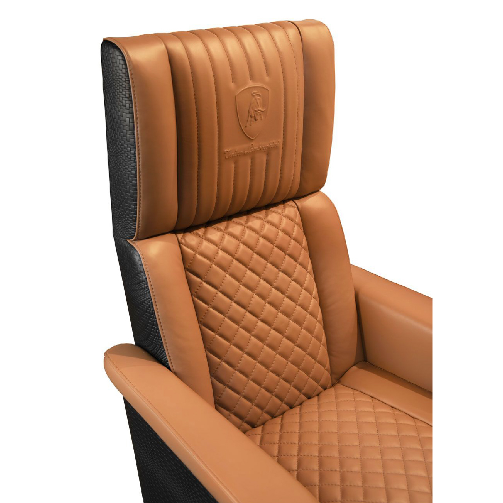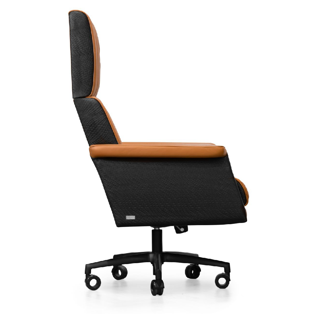 Leather art. Daino col. Whiskey with canettè & embossed logo on headrest, backrest & seat with matelassè stitching, “Bricks” print on sides art. Cuoio col. Pure Black, with tone on tone stitching, outback in carbon fiber glossy finish, metal base col. black matt with adjustable height mechanism & oscillating mechanism, with wheels.