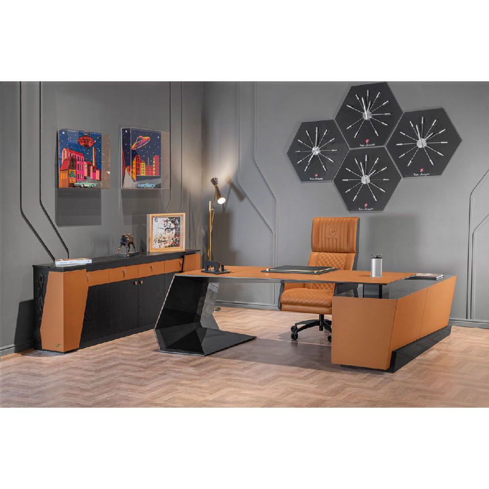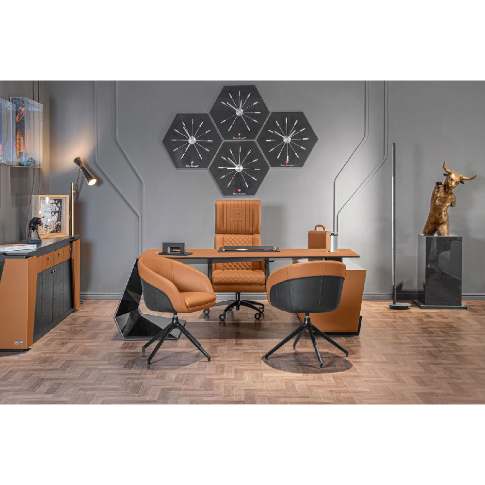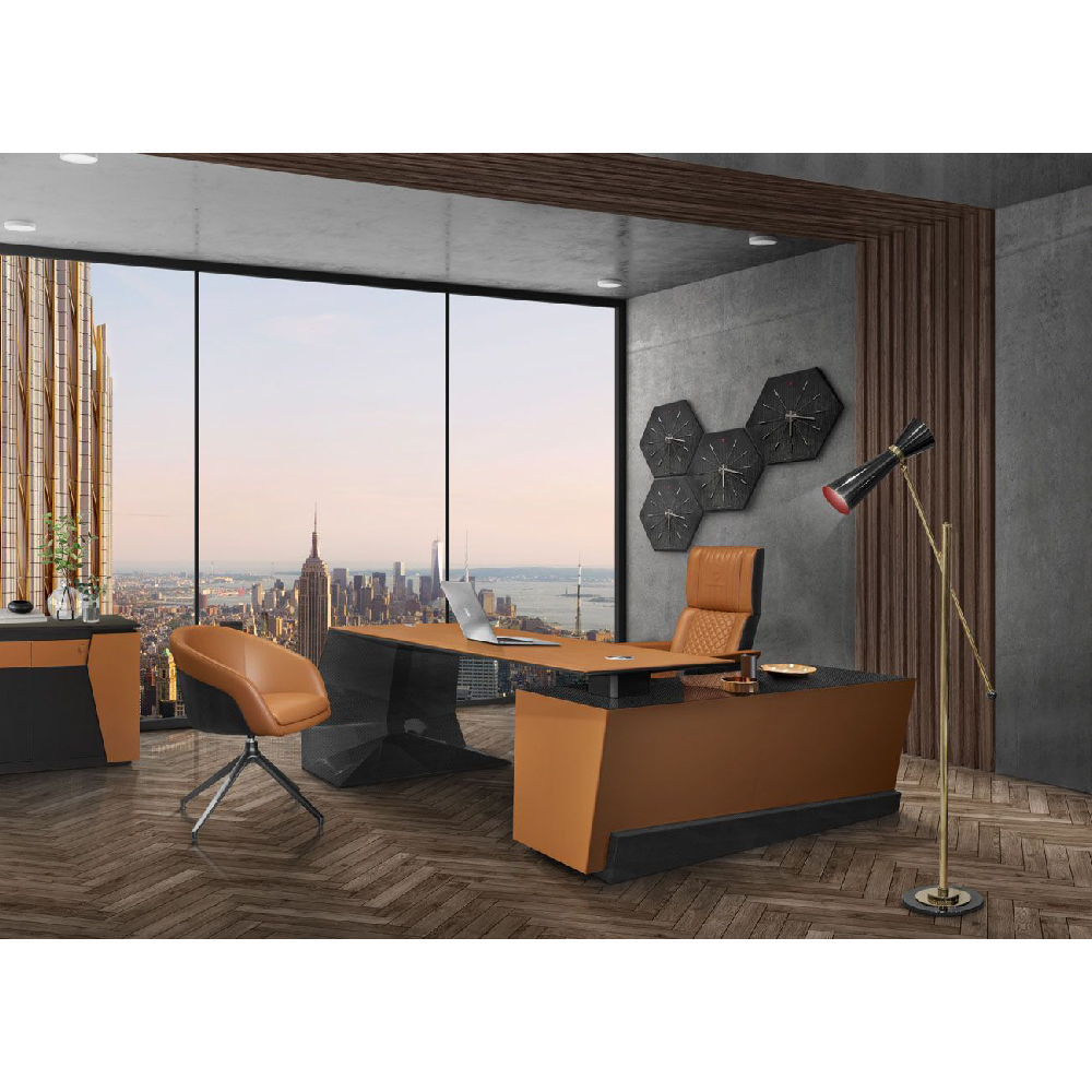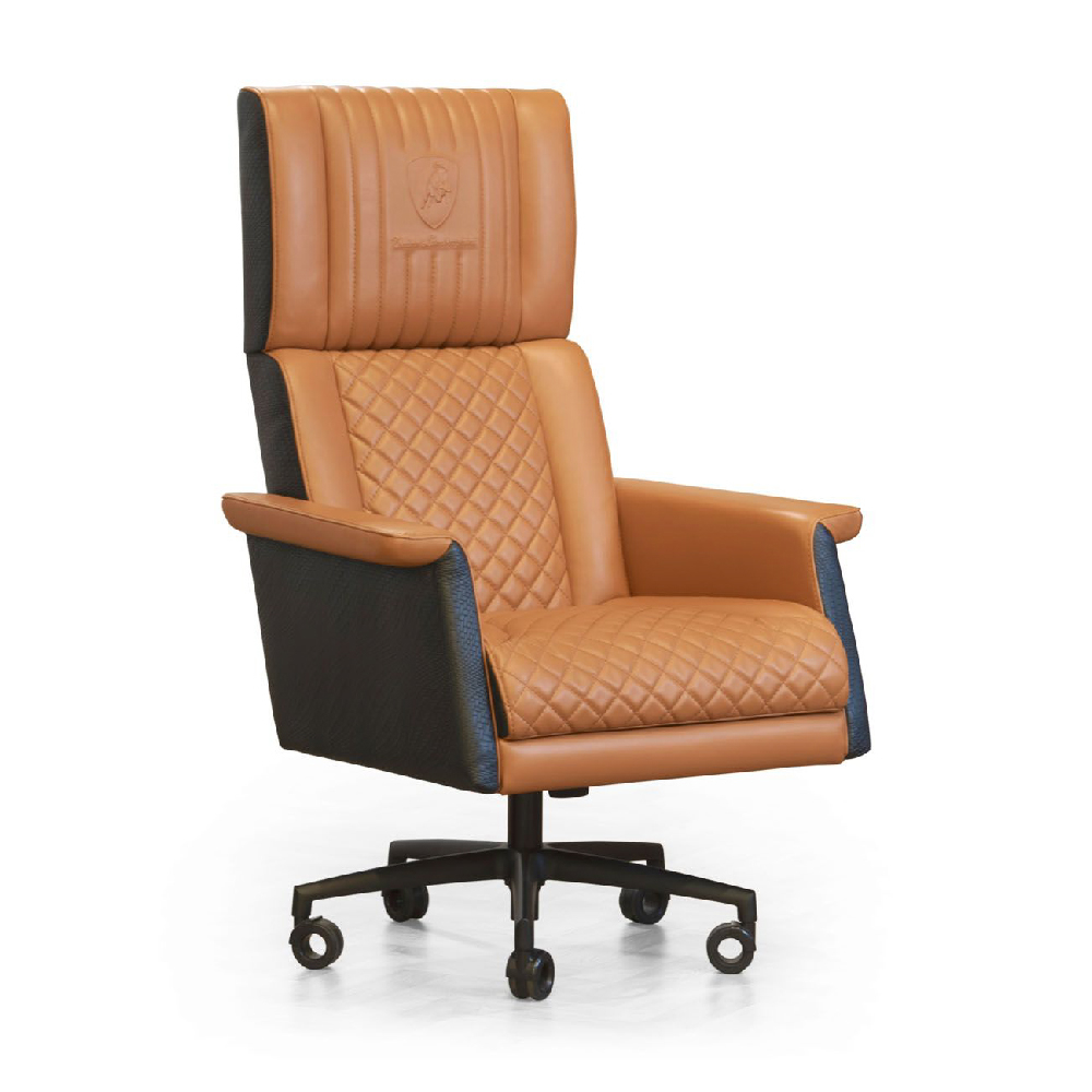 Leather art. Daino col. Whiskey with canettè & embossed logo on headrest, backrest & seat with matelassè stitching, “Bricks” print on sides art. Cuoio col. Pure Black, with tone on tone stitching, outback in carbon fiber glossy finish, metal base col. black matt with adjustable height mechanism & oscillating mechanism, with wheels.