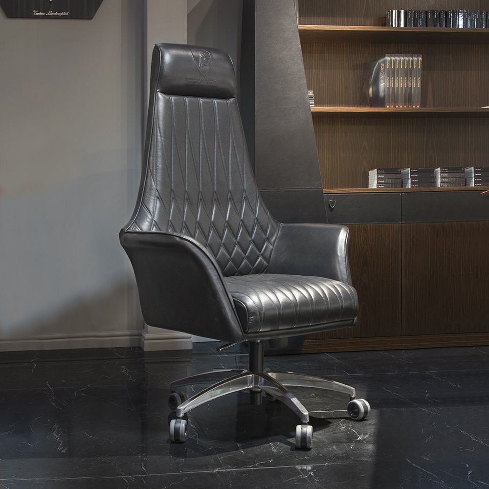 Seat and backrest in leather art. Daino col. Coal with piping in leather art. Daino col. Whiskey, outer structure in leather art. Daino col. Coal with “Bricks” print, base and wheels lacquered matt black .