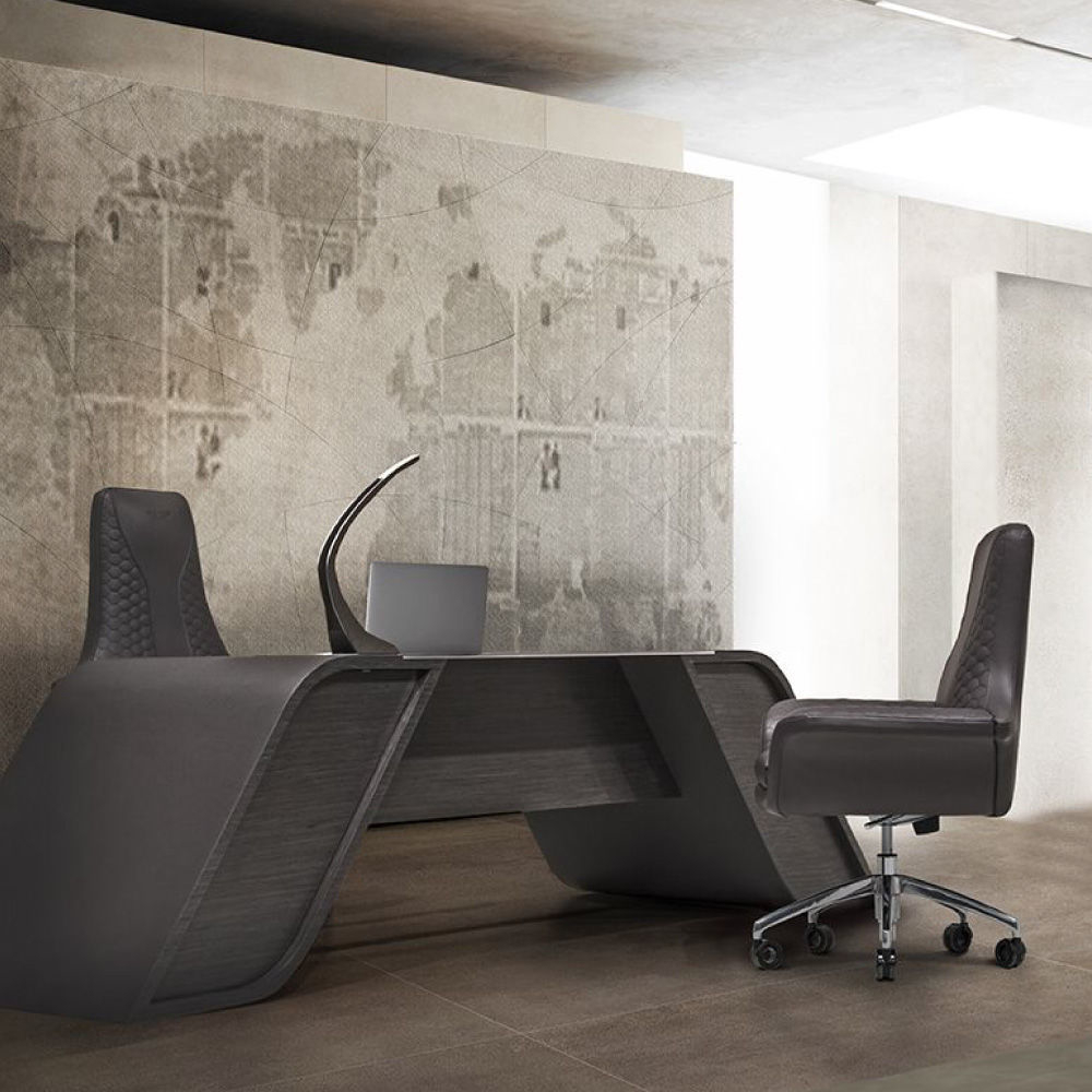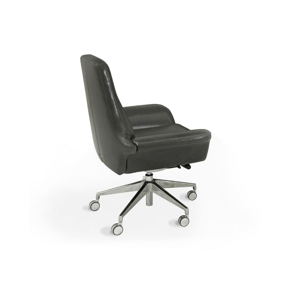Low arms, upholstery in leather art. Deer col. 298 Root. Metal base col. Nickel, with wheels.