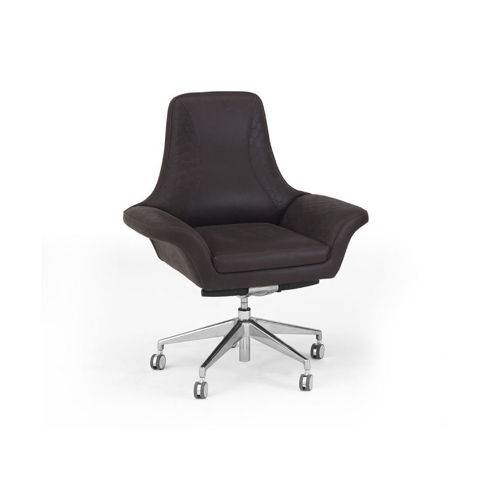 Low arms, upholstery in leather art. Deer col. 298 Root. Metal base col. Nickel, with wheels.