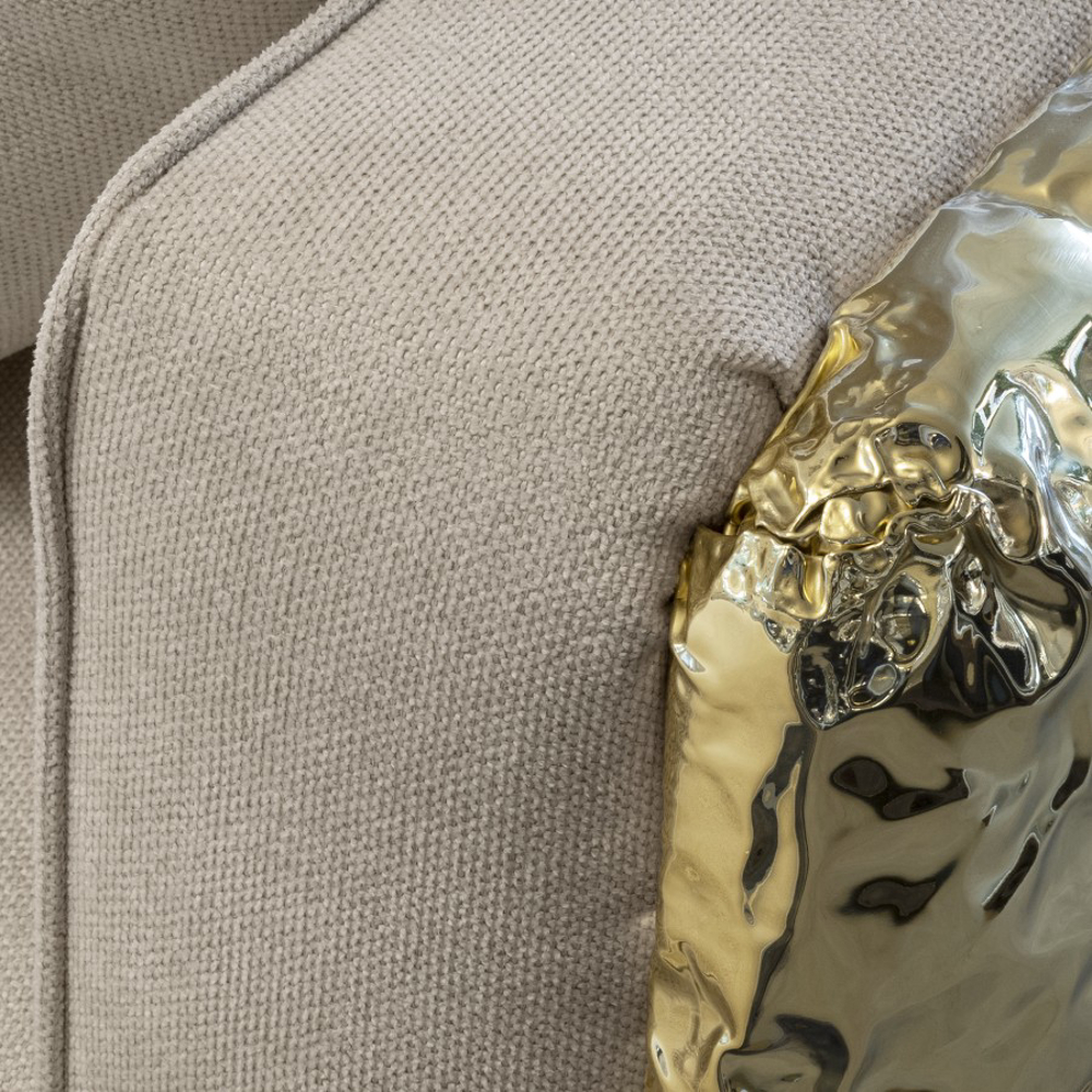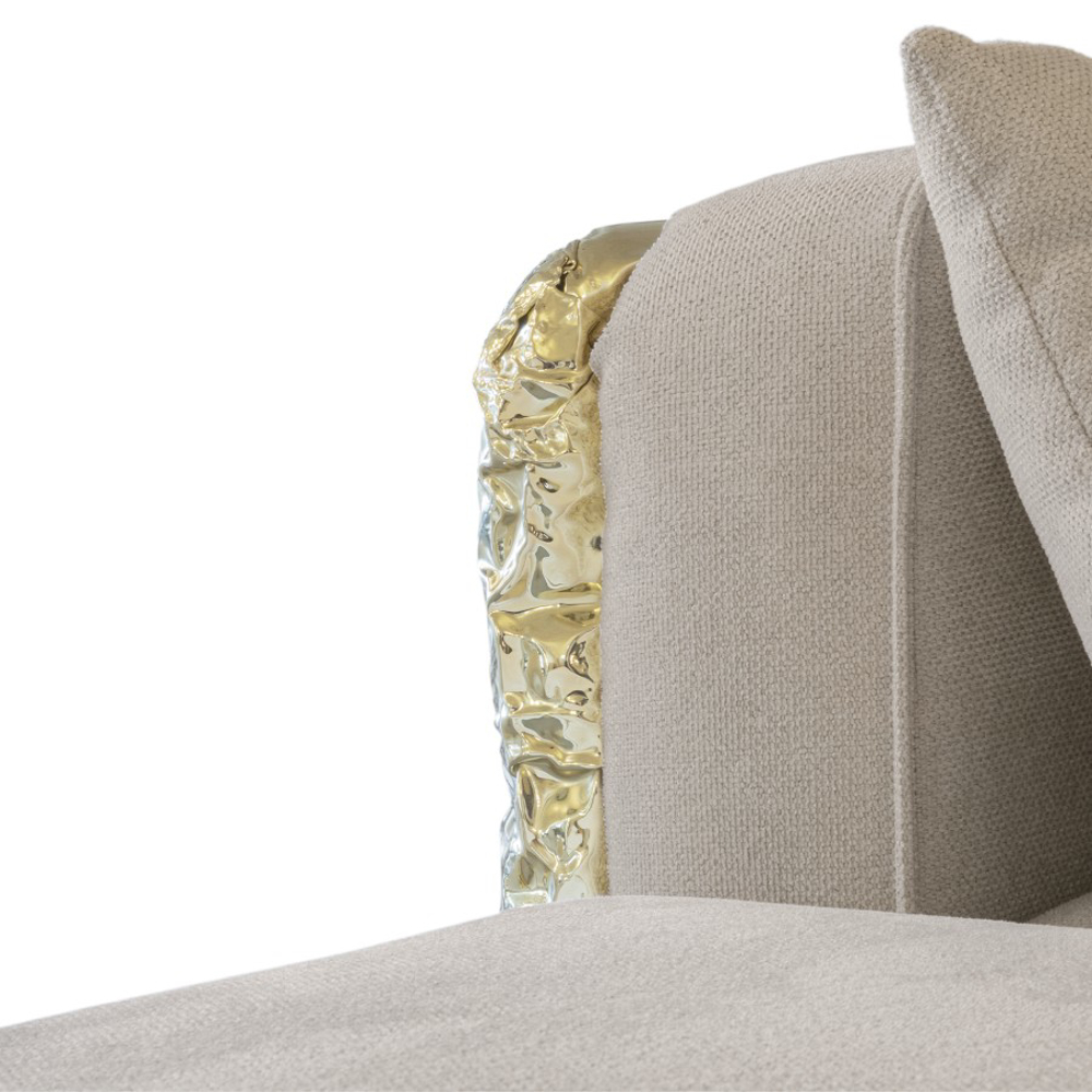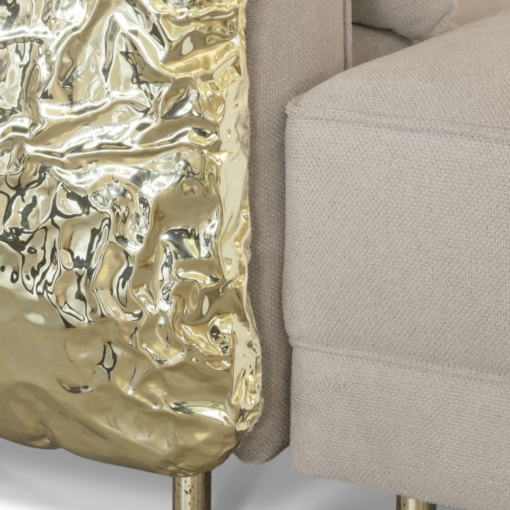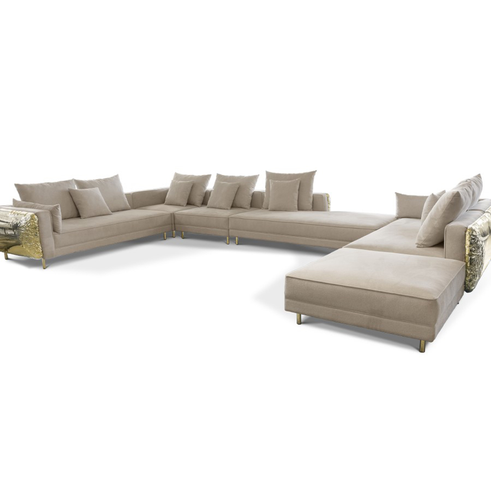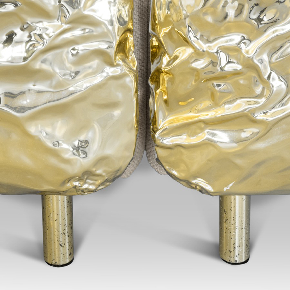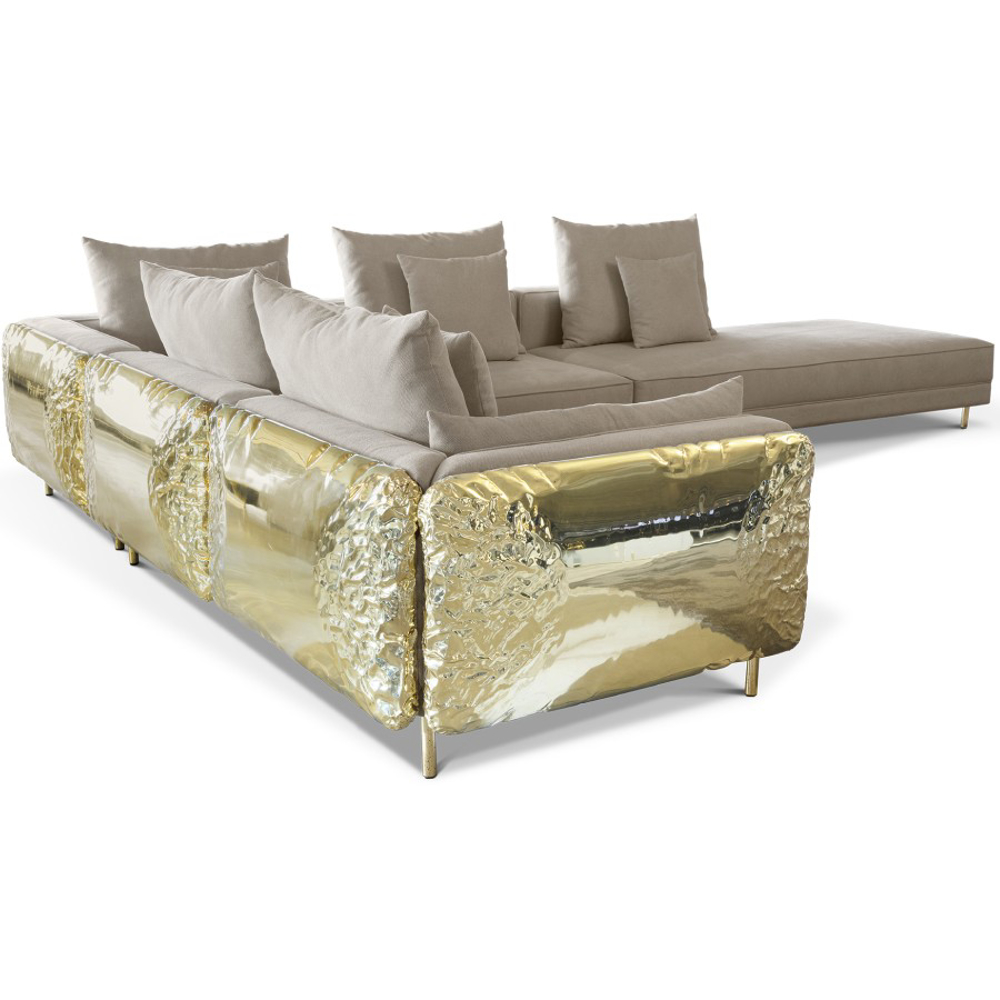 Imperfectio modular sofa is composed of a linear L-shaped sofa paired with upholstered ottoman. The solid wood structure is enveloped by irregular polished brass, founded on elegant slim brass feet. Available in wide selection of natural and bright colors.