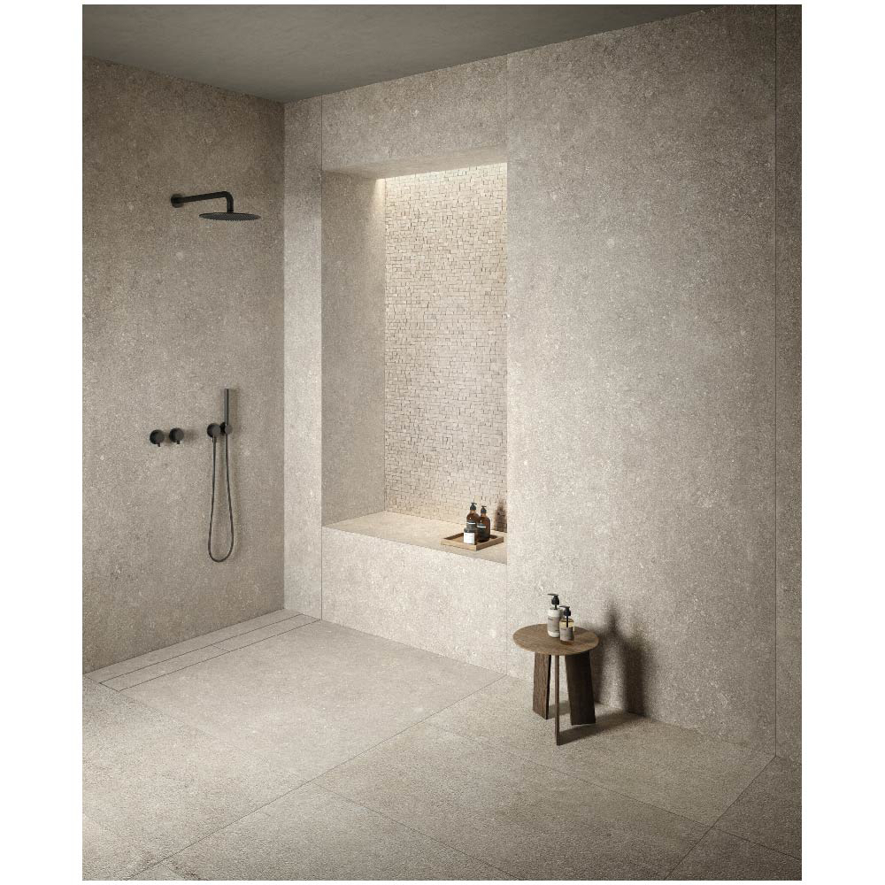 With its blend of natural stone effect, textured surfaces, and high-performance porcelain stoneware, the Reverse series is ideal for creating coordinated design projects with a strong architectural identity.