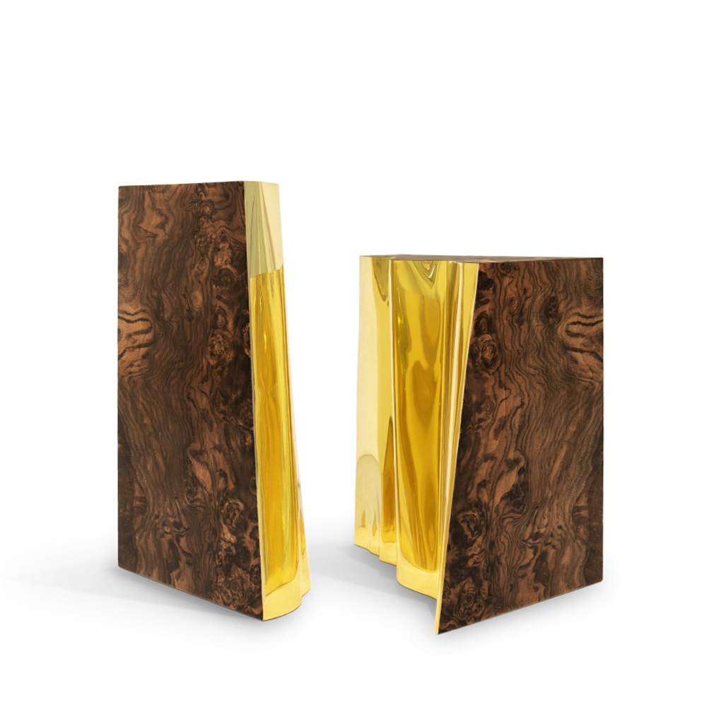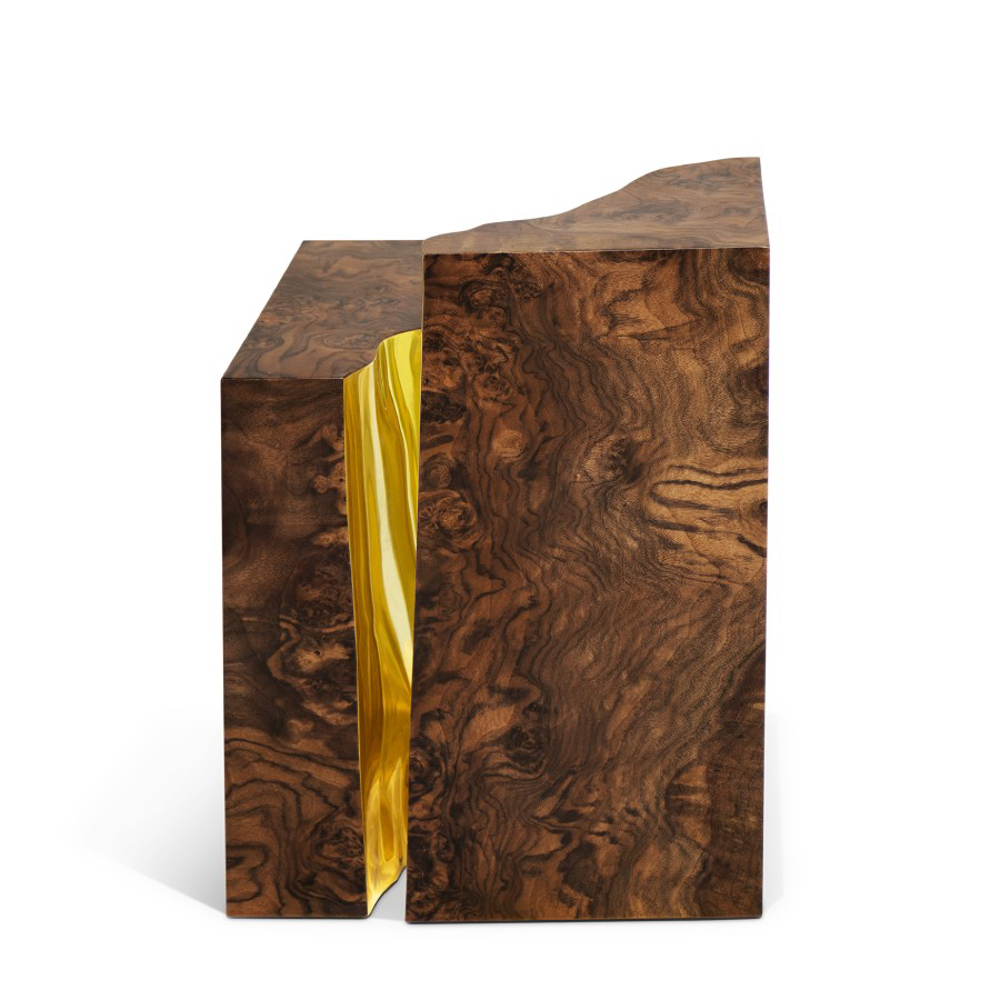 Polished brass and walnut root veneer.