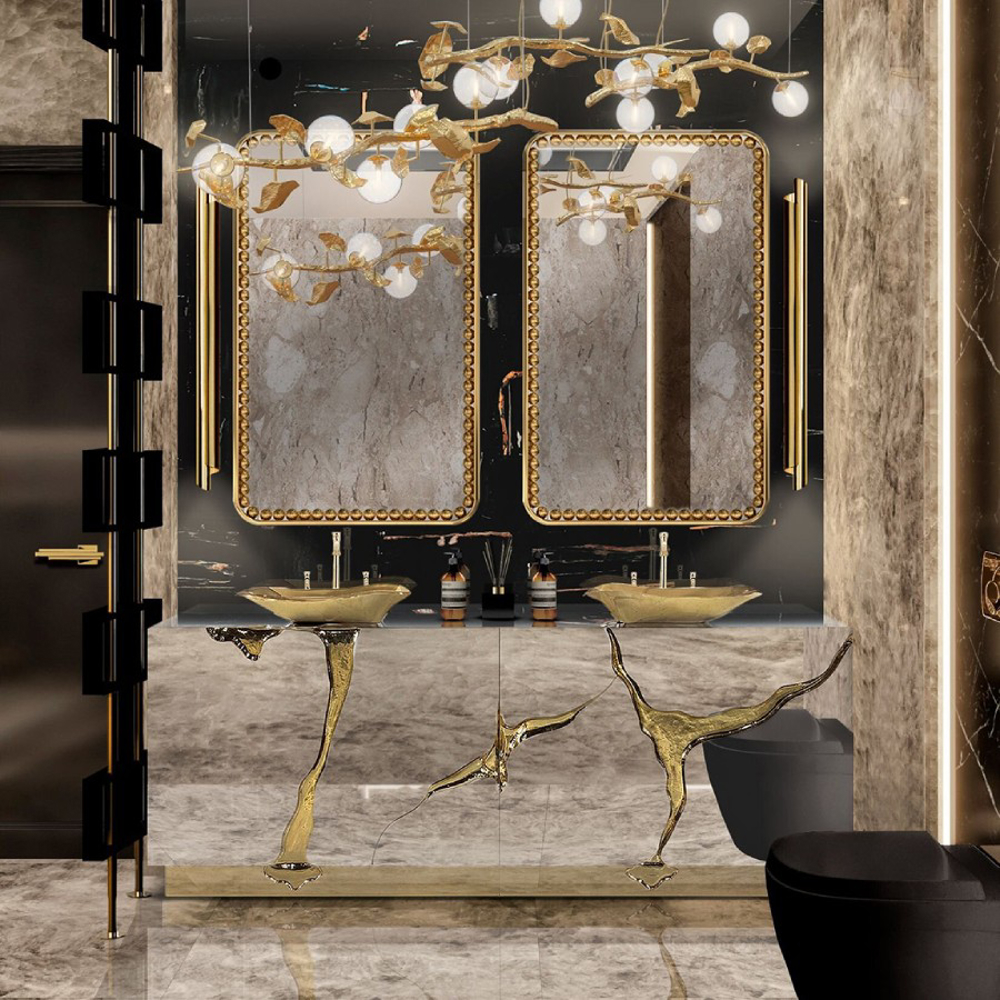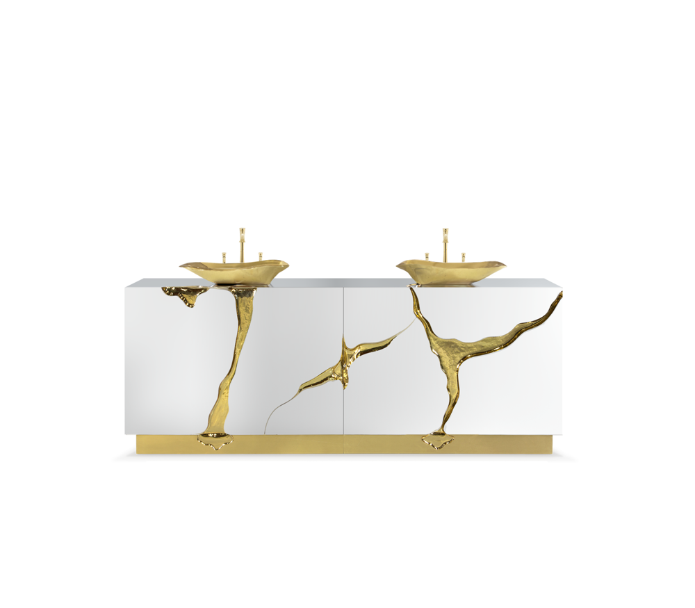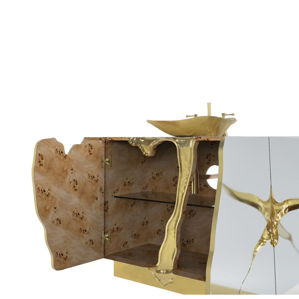Structure: Sheet of stainless steel | Polished brass tears, High gloss varnish; Inside: Poplar Root Veneer; Four doors; Water drainage: Wall