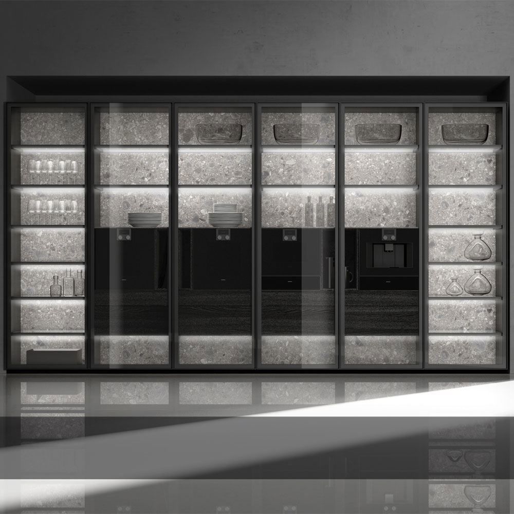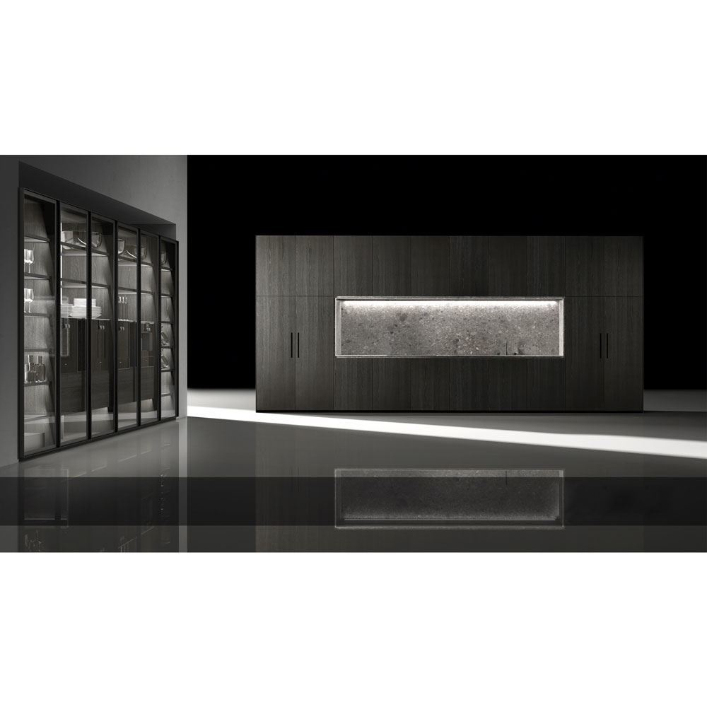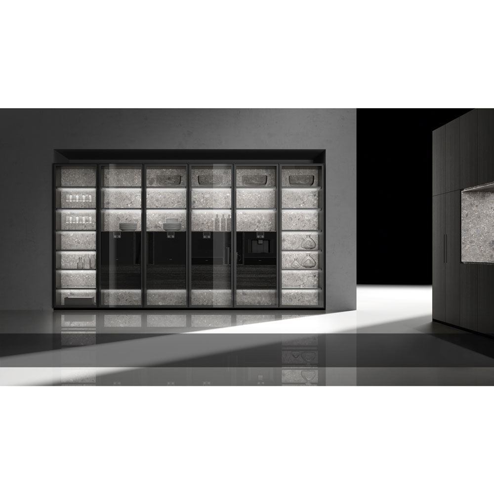 On the second hand, the column area holds a large storage area. Appliances, shelves, drawers and sliding coplanar door system are combined so space has the functionality and ergonomics which is always so present in Doca kitchens.