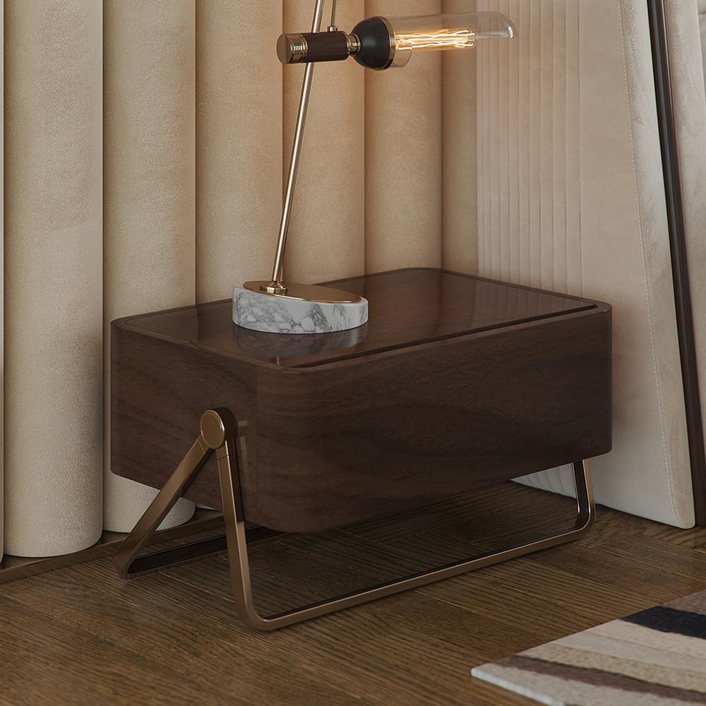 Materials and Finishes: Matte Walnut Wood and Polished Brass.