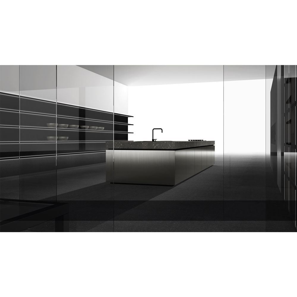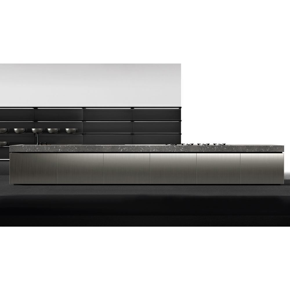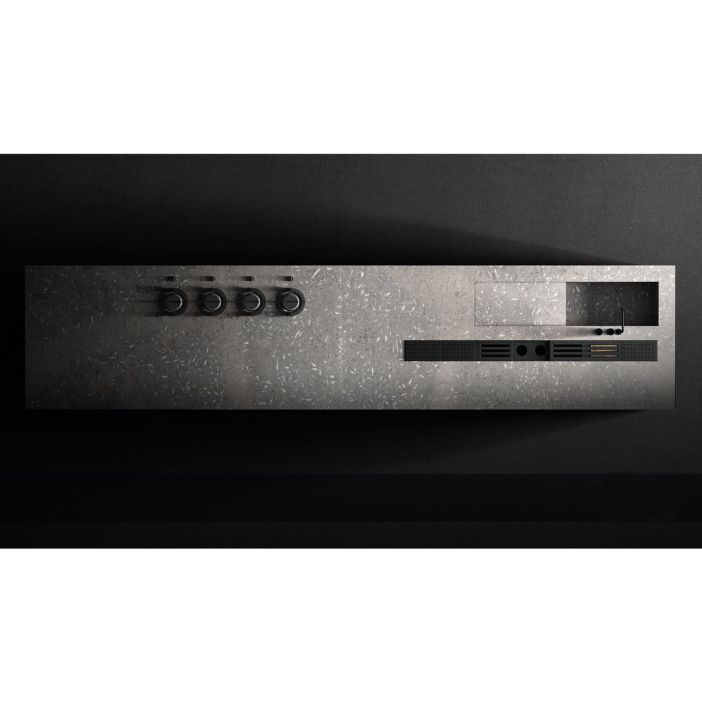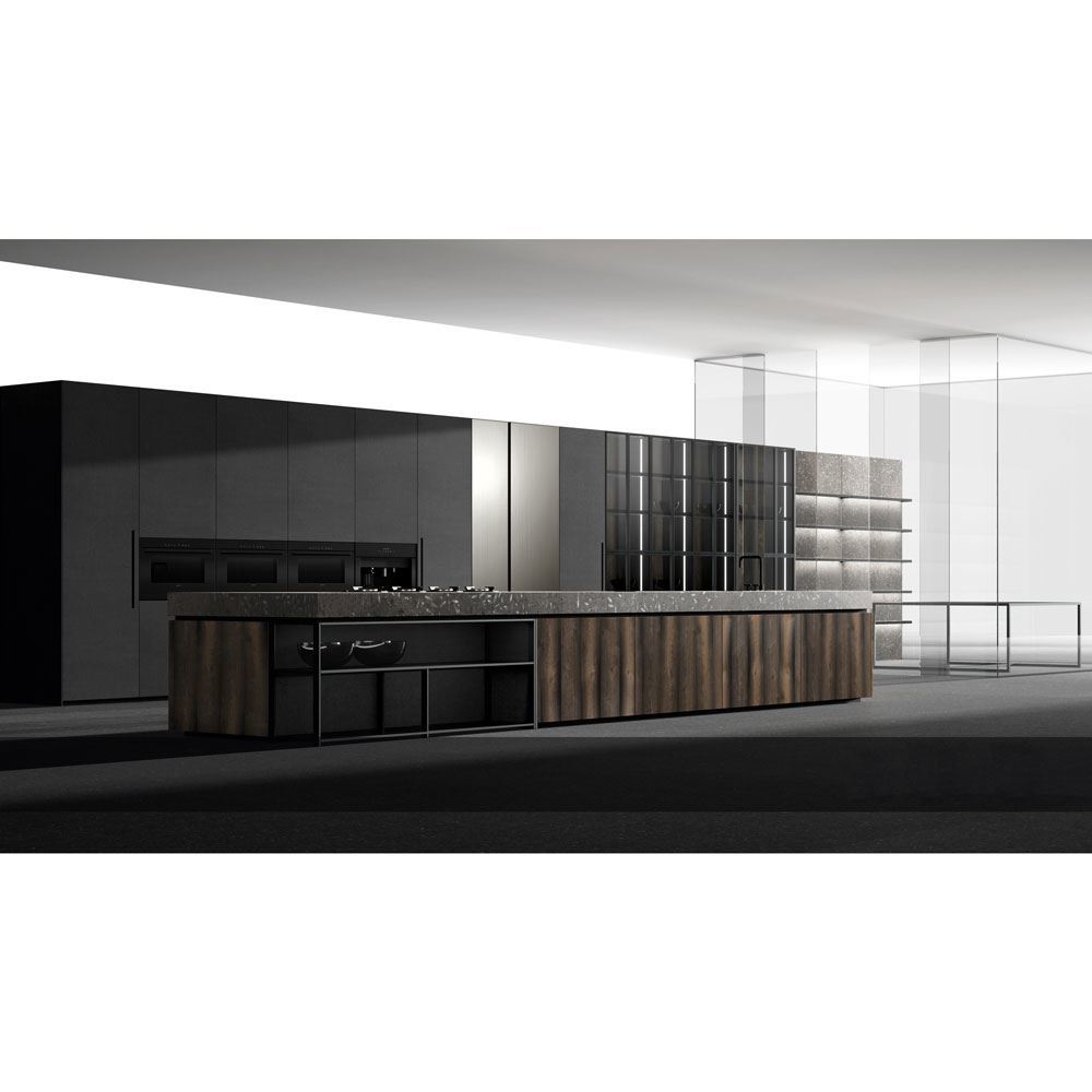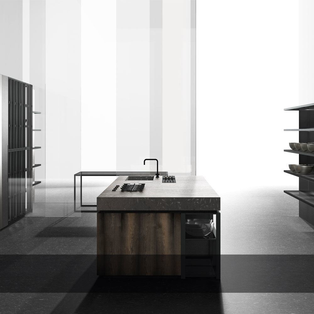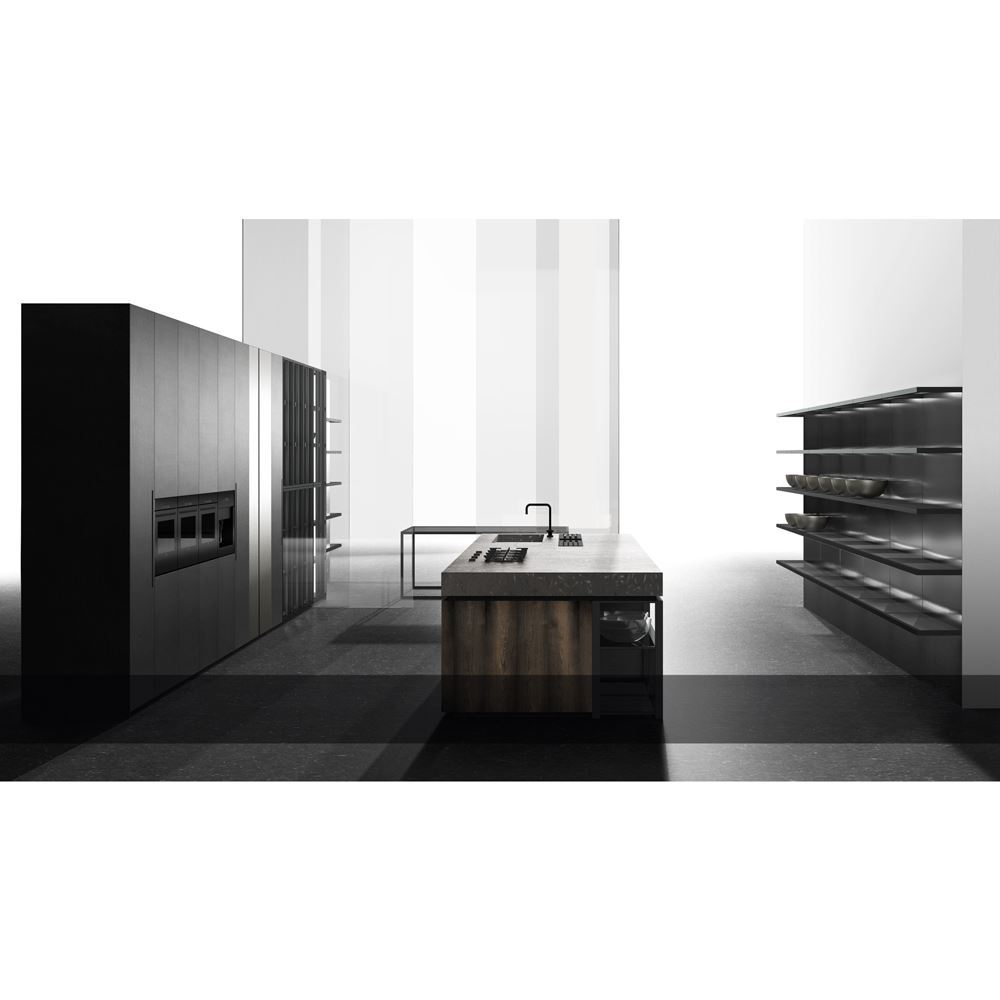 Doca, in the same way, creates a new concept of kitchen, where the latest generation materials, such as steels and dark DM format join old materials such as the fossil oak with more than 1000 years old and the massive natural stone countertop extracted from a quarry unique in Europe of which we do not know its exact antiquity, but that its surface replete with fossils reveals its long existence.