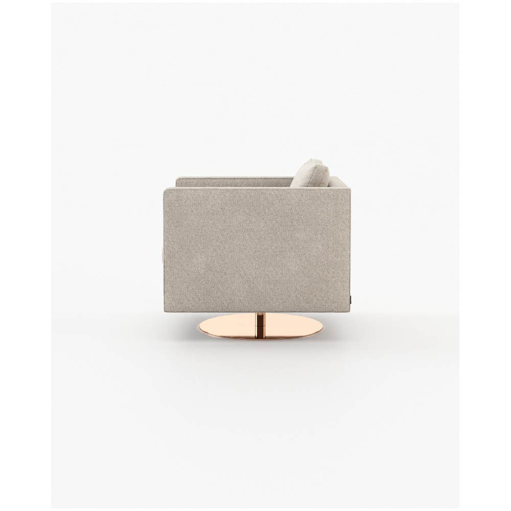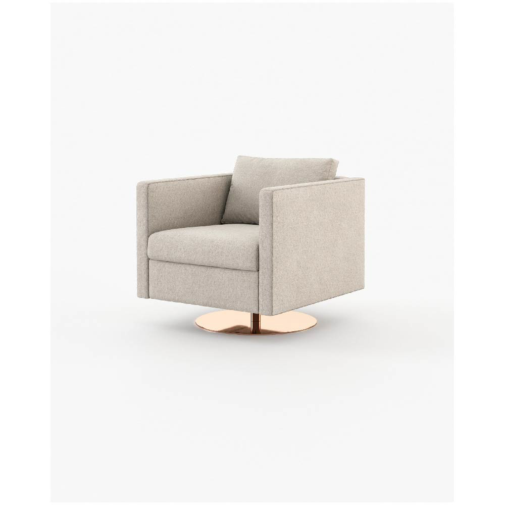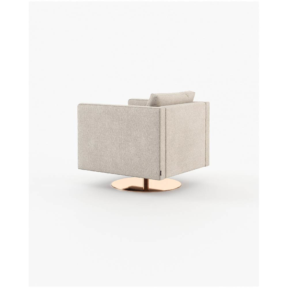 Marlow is an inviting armchair that appears to float above a slim metal base. It adds elegance to any room and is great for spinning around in.