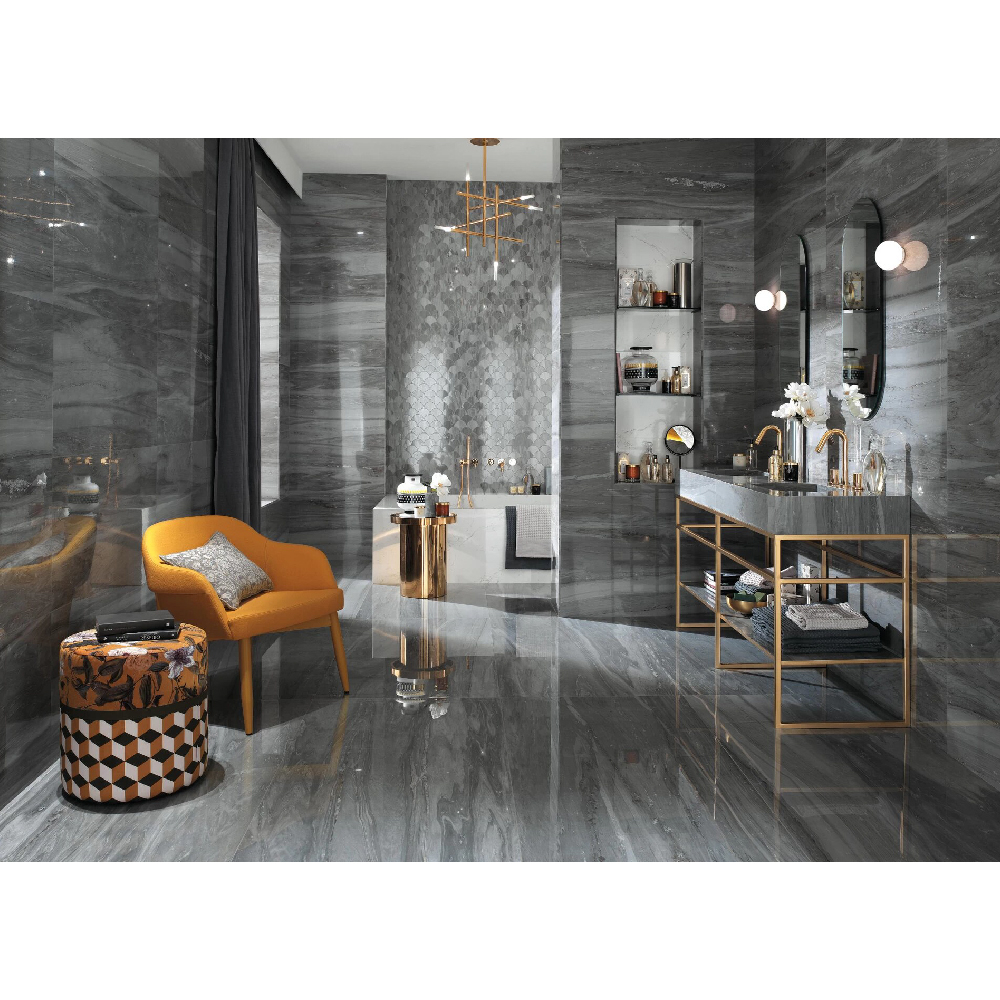 The neutral-toned original marbles are mostly Italian in origin, renowned throughout the world for their purity, balance of color, and the vein patterns.